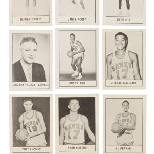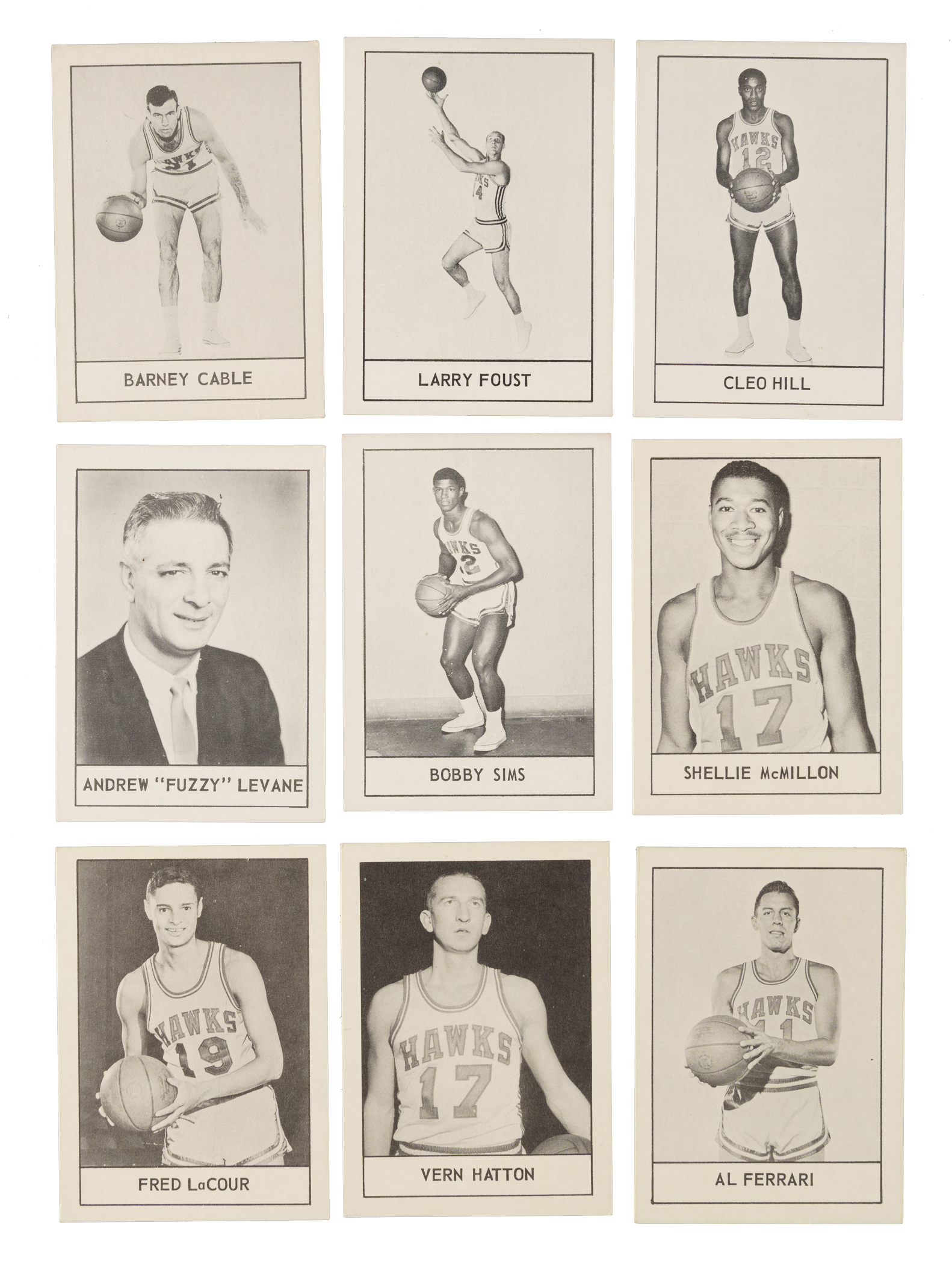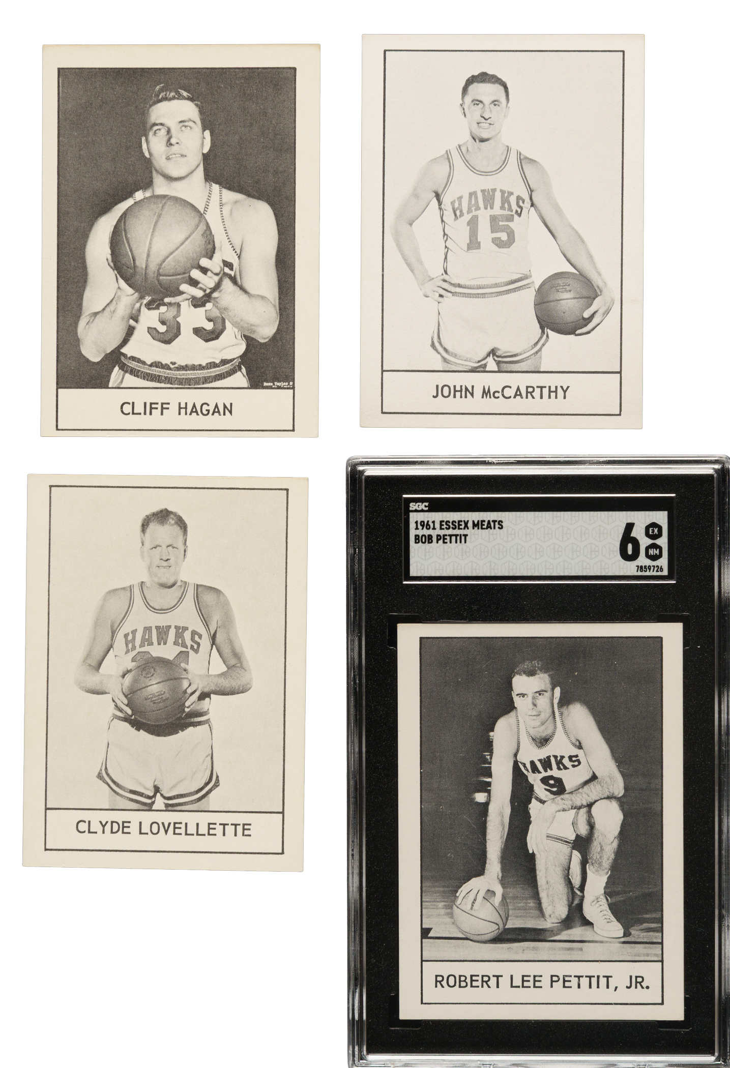 Complete set of 1961 Essex Meats St. Louis Hawks Basketball cards. Condition ranges from Gd to Ex-Mt (averaging Vg/Vg-Ex). Keys: Hagan (Gd), Lovellette (Vg-Ex), and Pettit (SGC EX/NM 6). Total: 13 cards.