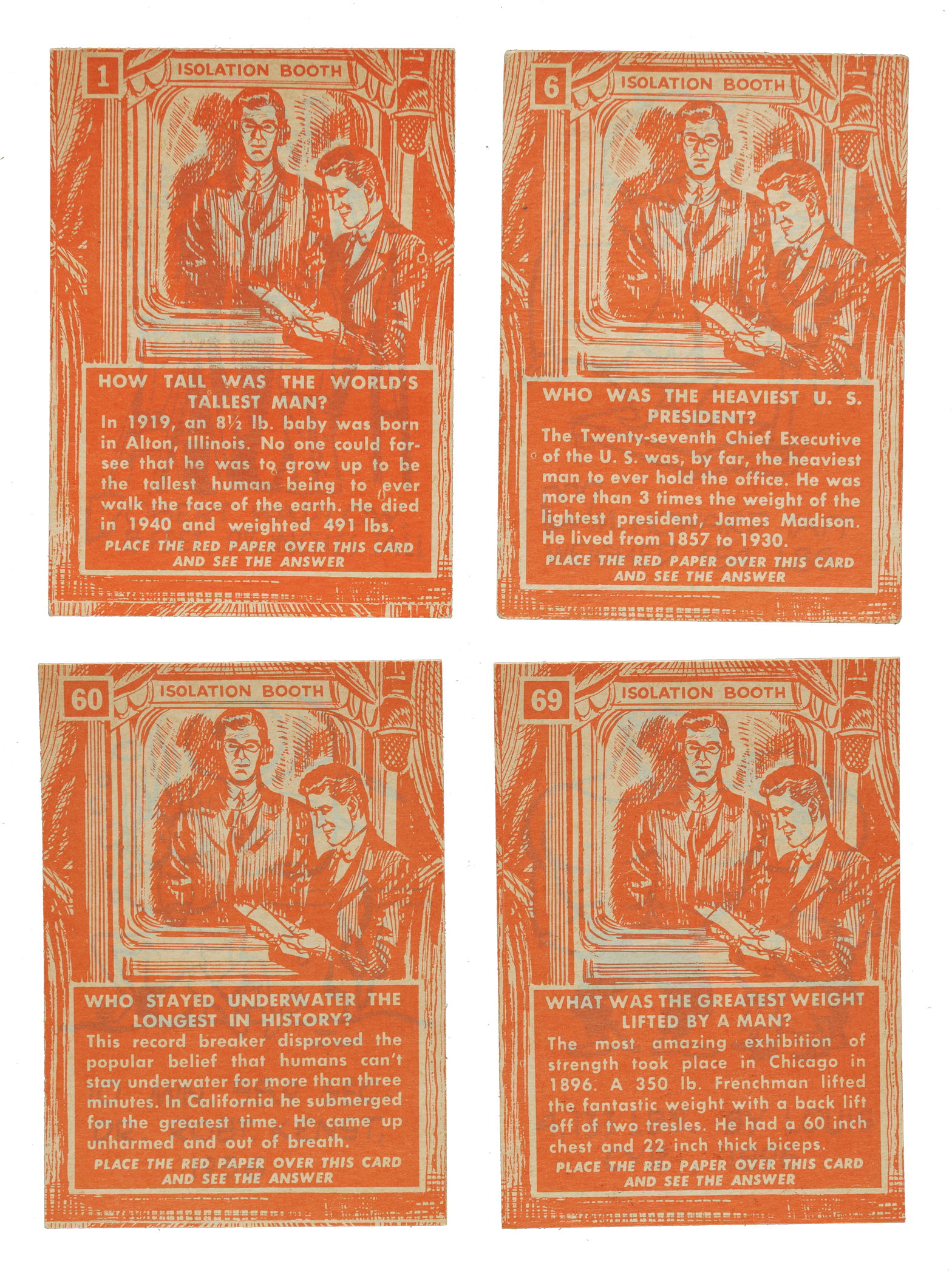 Complete 88-card set of 1957 Topps "Isolation Booth" trading cards. Condition is 27% Nr/Mt, 49% Ex to Ex-Mt, and 24% Vg to Vg-Ex (including a few lesser). Total: 88 cards. The size/weight of this item requires that there will be an additional shipping charge for this lot.