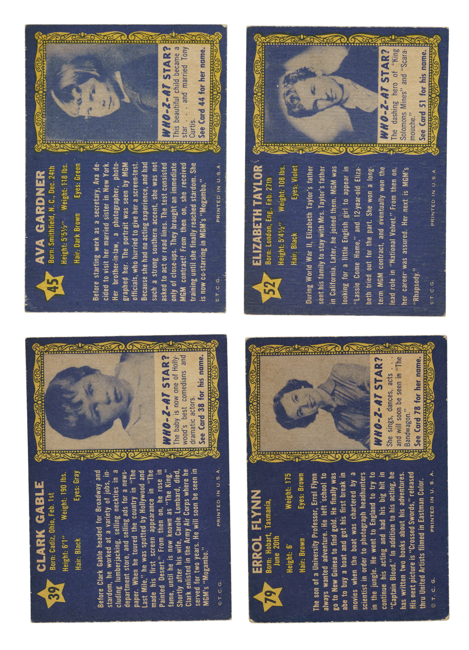 Topps produced the most highly regarded American movie star set of the post-WWII era in 1953. Offered is a complete 80-card set of "Who-Z-At Star." The set features many of the most famous movie stars of the era, including Errol Flynn, Spencer Tracy, Elizabeth Taylor, Ava Gardner, Lana Turner, Clark Gable, and Gene Kelly. The name of the set “Who-Z-At Star” refers to the identification quiz printed on the back of each card. Condition is 24% Ex to Ex-Mt, 70% Vg to Vg-Ex, and 6% Gd. This is an attractive mid-grade set of this popular 1950s nonsport issue. Total: 80 cards.