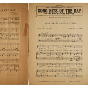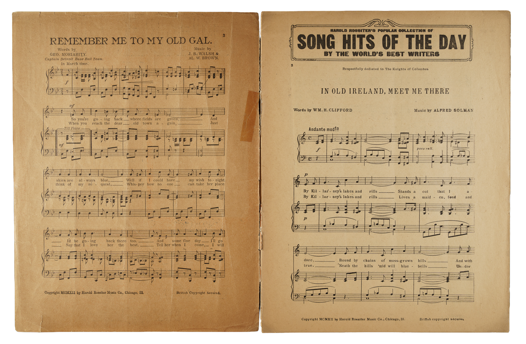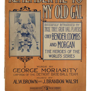 1912 Remember Me To My Old Gal sheet music. Featuring Chief Bender, Jack Coombs, and Cy Morgan of the Philadelphia Athletics. Words by George Moriarity and music by Al W. Brown and J. Brandon Walsh. Published by Harold Rossiter Music Company. The sheet music's (10.25 x 13.25 inches) front and back covers are partially detached. Additionally, there is a clear tape repair along the back of the front cover and multiple edge tears. Poor condition overall. The size/weight of this item requires that there will be an additional shipping charge for this lot.