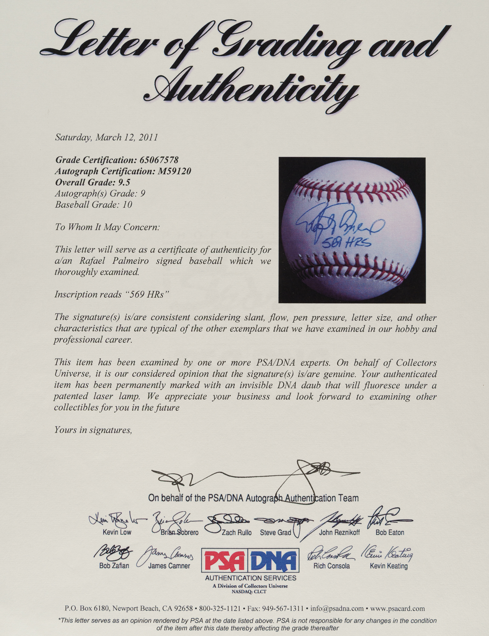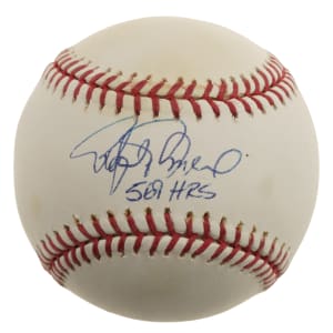 Baltimore Orioles Rafael Palmeiro signed baseball. PSA/DNA has graded the ball GEM MINT 10 and the signature MINT 9 for an overall grade of MINT+ 9.5. Full LOA from PSA/DNA.