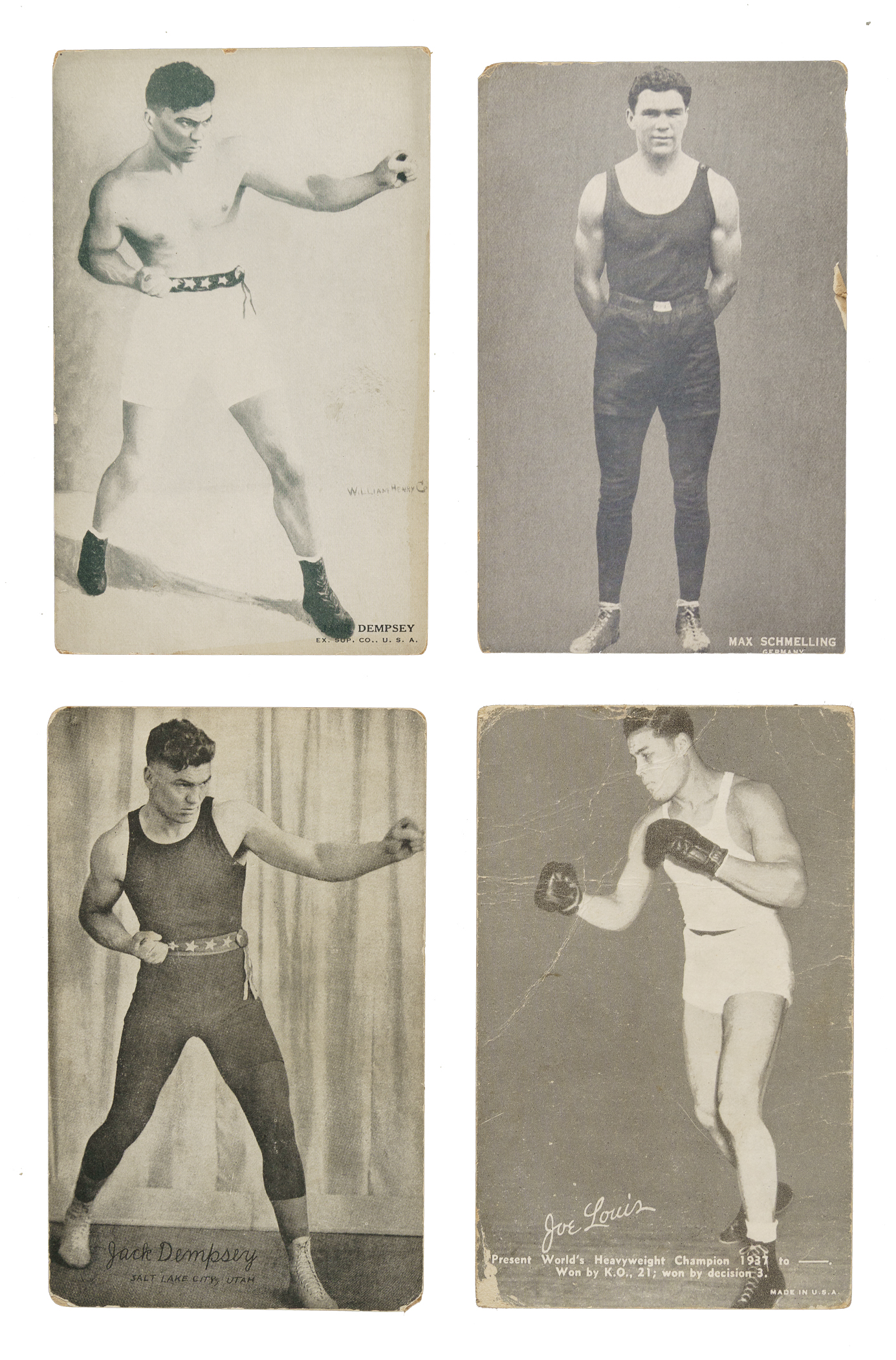 Substantial collection of ninety-four boxing cards from various Exhibit-card sets issued during the 1920s through the 1960s. This collection is highlighted by several Hall of Famers, including Joe Louis, Jack Dempsey, and Gene Tunney. Condition is 8% Vg-Ex to Ex (mostly from the 1947-1966 series), 30% Gd to Vg, and 62% Pr to Fr (including five with missing pieces). Keys: Individual cards: Two Carpentier, ten Dempsey, Gans, Graziano, five LaMotta, Leonard, Louis (Pr), J. O'Brien, Patterson, two Schmeling, three Sharkey, and four Tunney. Multi-boxer cards: Three Dempsey (Training Quarters at Atlantic City, Table of Comparisons w/ Wills), ten Dempsey/Sharkey ("The Long Count"), Jeffries/Blue, and Tunney/Sharkey (Table of Comparisons). A presentable medium- to low-grade collection of cards from these popular sets. Total: 94 cards.