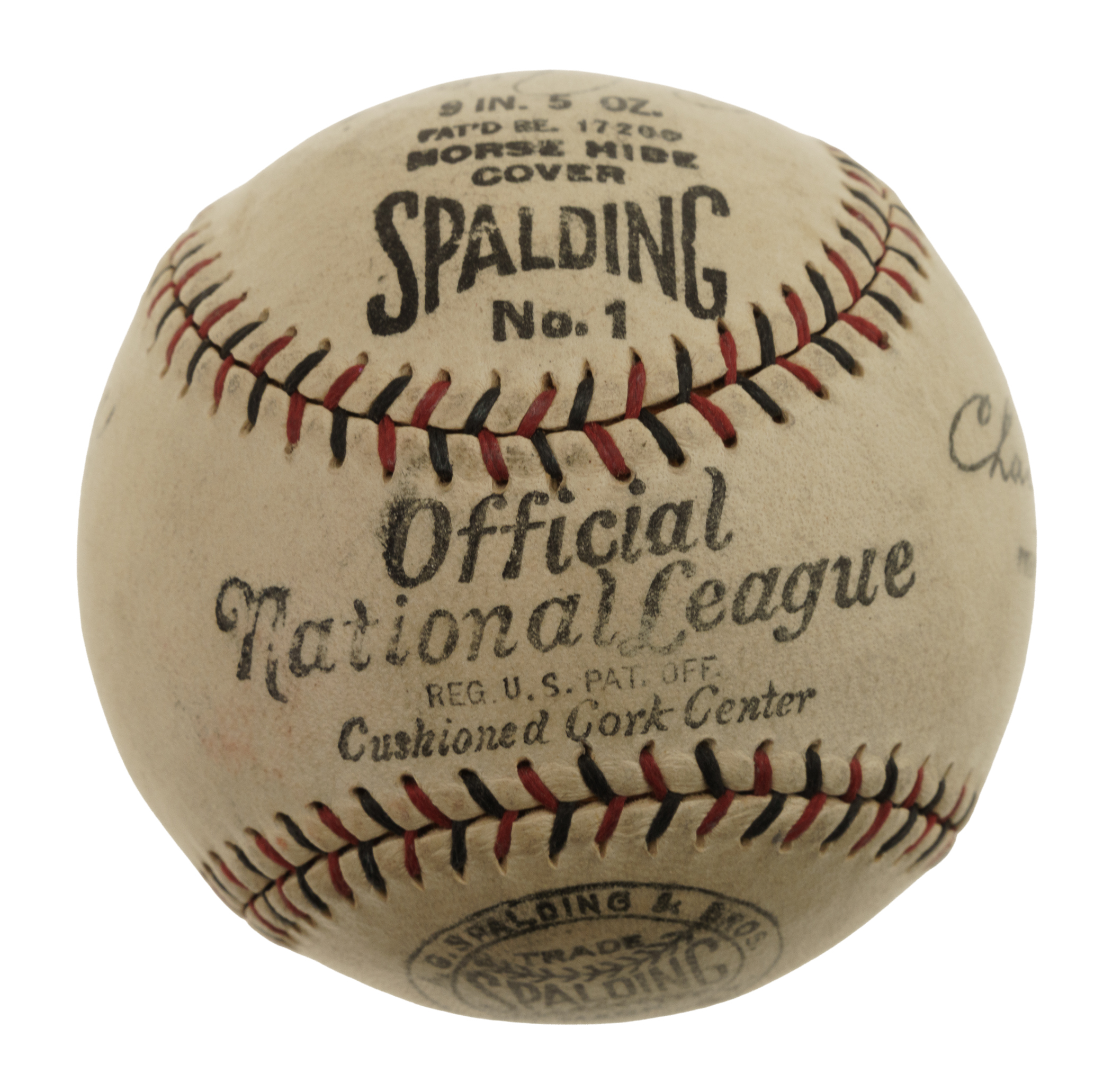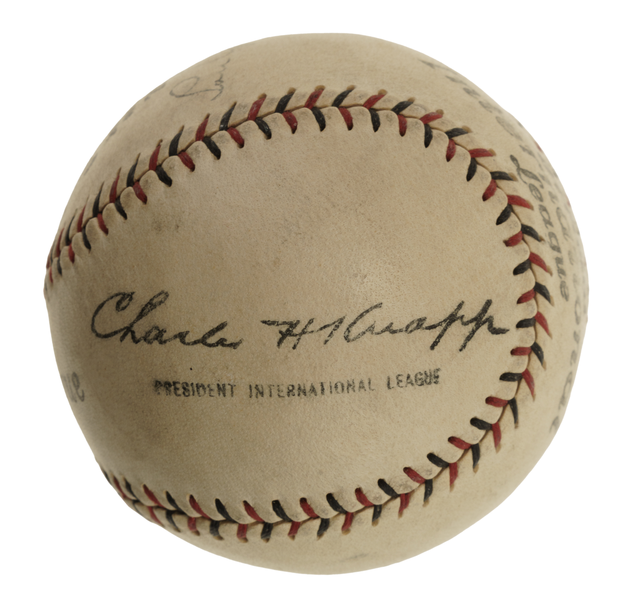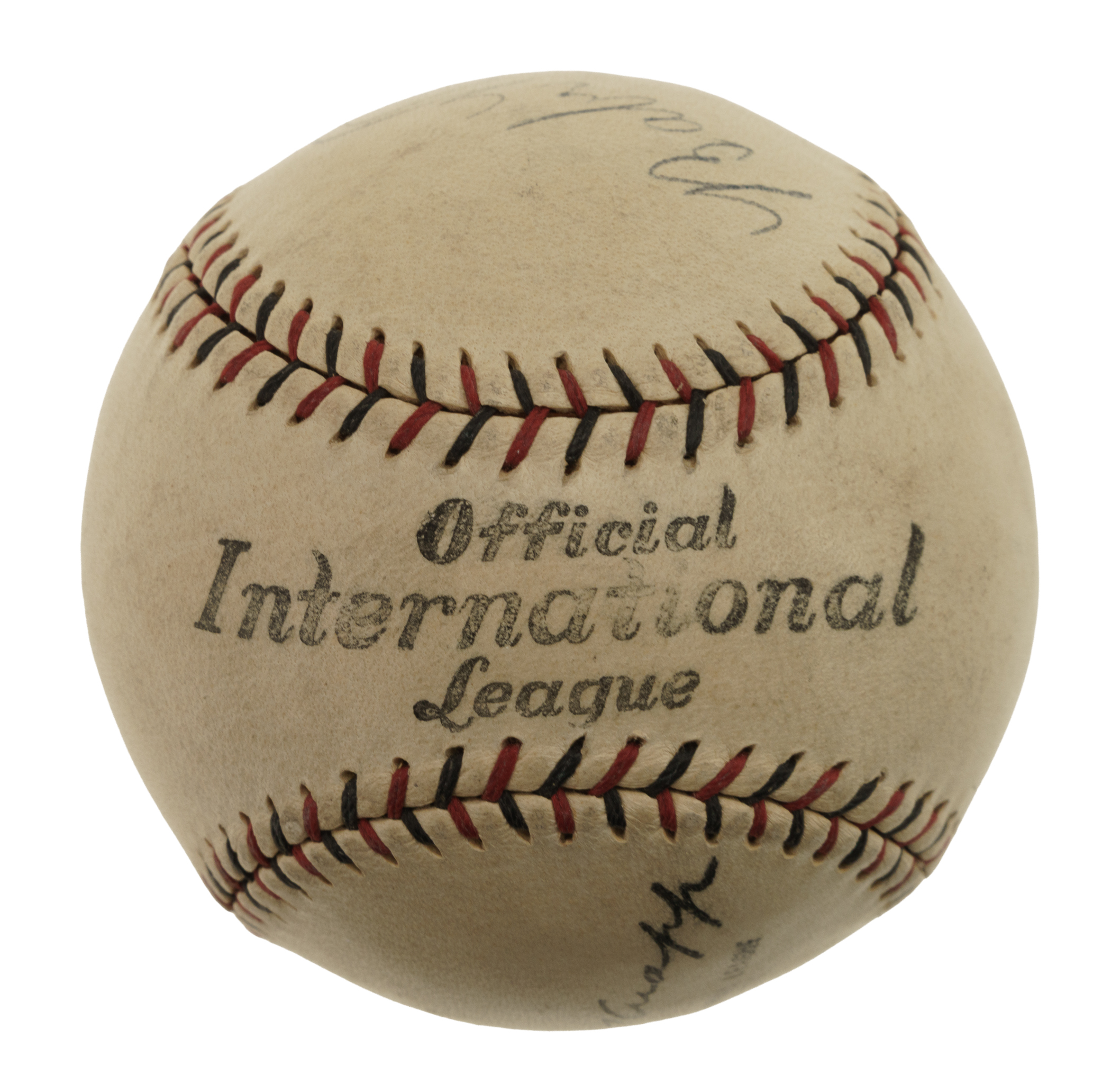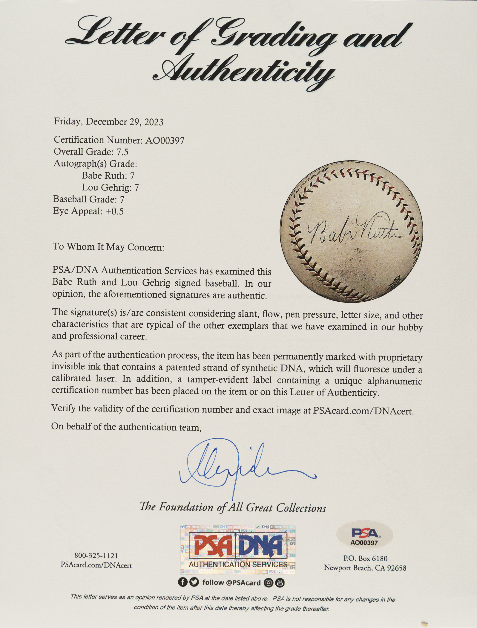 Official National League/International League baseball signed in black fountain pen by both Babe Ruth and Lou Gehrig. Graded NM+ 7.5 by PSA/DNA, the Ruth and Gehrig signatures are both deemed NM 7. A ball grade of '7,' plus a half point for eye appeal, results in the overall NM+ 7.5 assessment by PSA. The ball, which features "Official National League" and "Official International League" stamping on each sweet spot, bears the stamped facsimile signature of International League president Charles Knapp on a side panel. Knapp was president of the International League from 1929 to 1936, which most likely indicates that the ball was signed by Ruth and Gehrig during their time together with the New York Yankees. (Ruth's final season with the Yankees was in 1934.) The ball displays light soiling and is in overall Excellent condition, with all of the manufacturer's stampings remaining bold and bright. Full LOA from PSA/DNA.