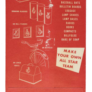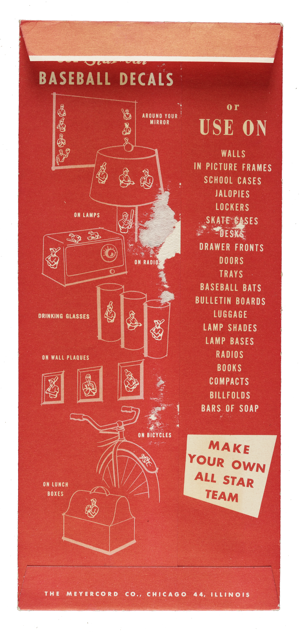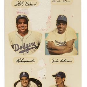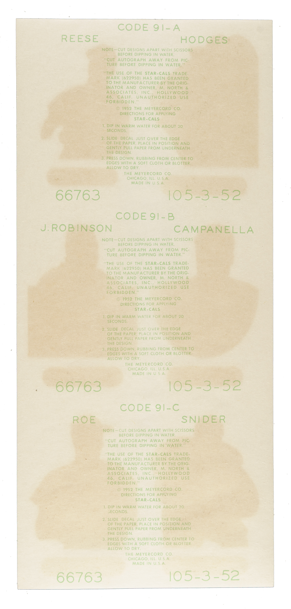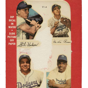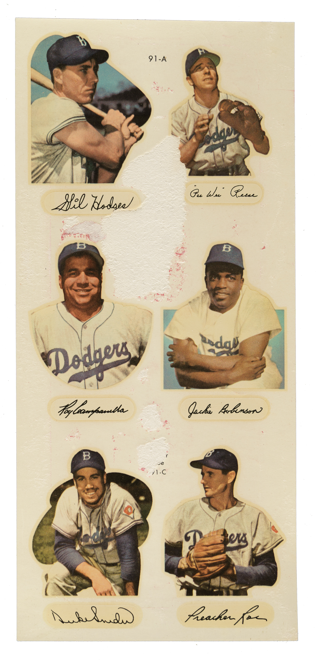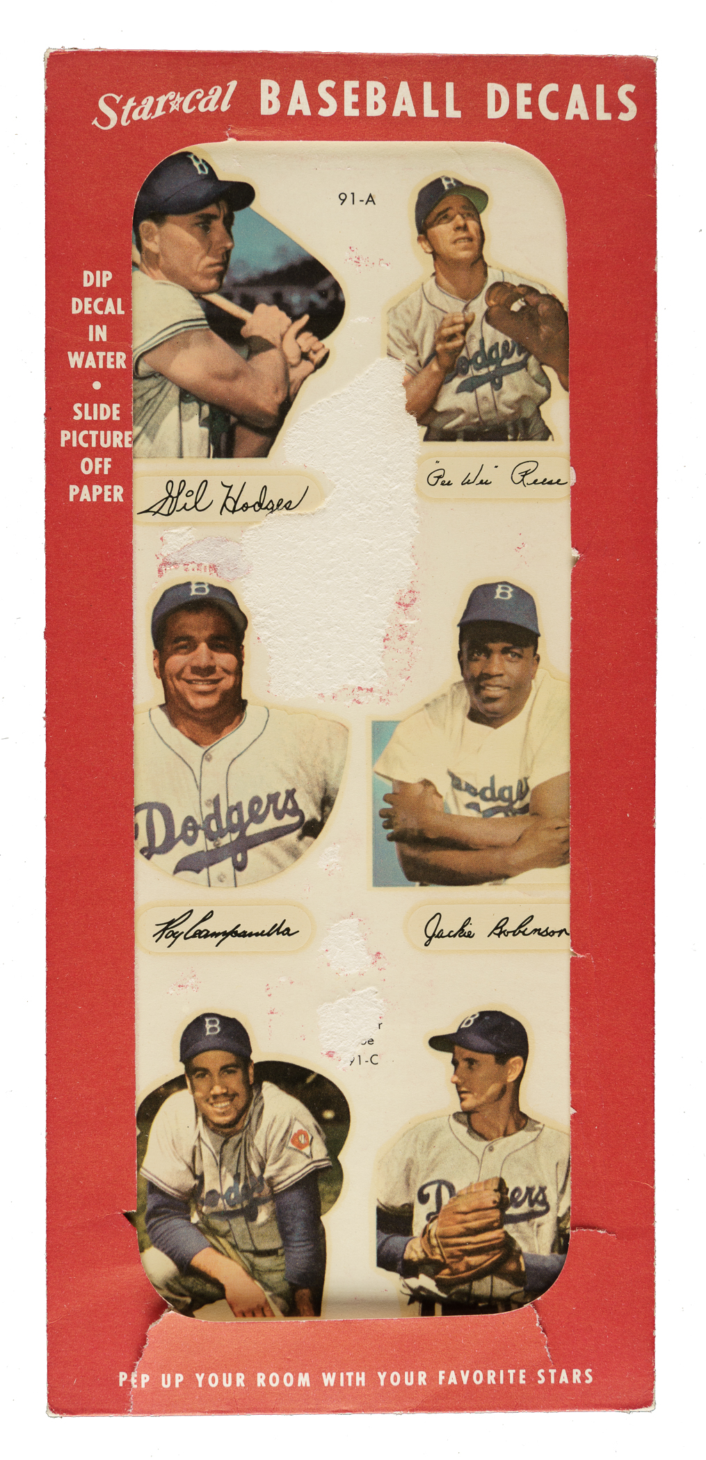 Extremely rare 1952 Star-Cal Decals (Type 2) six-picture promotional panel (5 x 11 inches) featuring exclusively Brooklyn Dodgers players, presented in its original red envelope packaging. This is only the seventh of its type that we have offered in the past 20 years and the first featuring the Dodgers! The three Type 2 decals featured on this large panel are #91-A Gil Hodges/Pee Wee Reese, 91-B Jackie Robinson/Roy Campanella, and 91-C Duke Snider/Preacher Roe. The decals have some areas of paper loss in the white background. The reverse has bold green text. The original envelope is clean with light creases, edge wear, and a couple small tears near the bottom edge. The reverse has a small touch of paper loss. This is an extreme rarity and ideal for display!