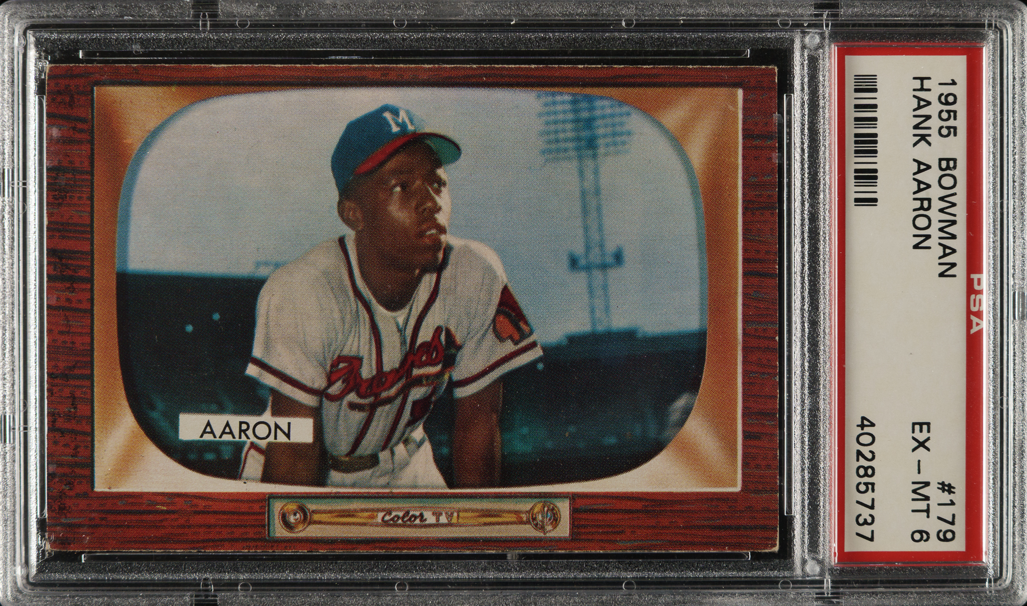 Graded EX-MT 6 by PSA. Milwaukee Braves Hall of Famer Hank Aaron.