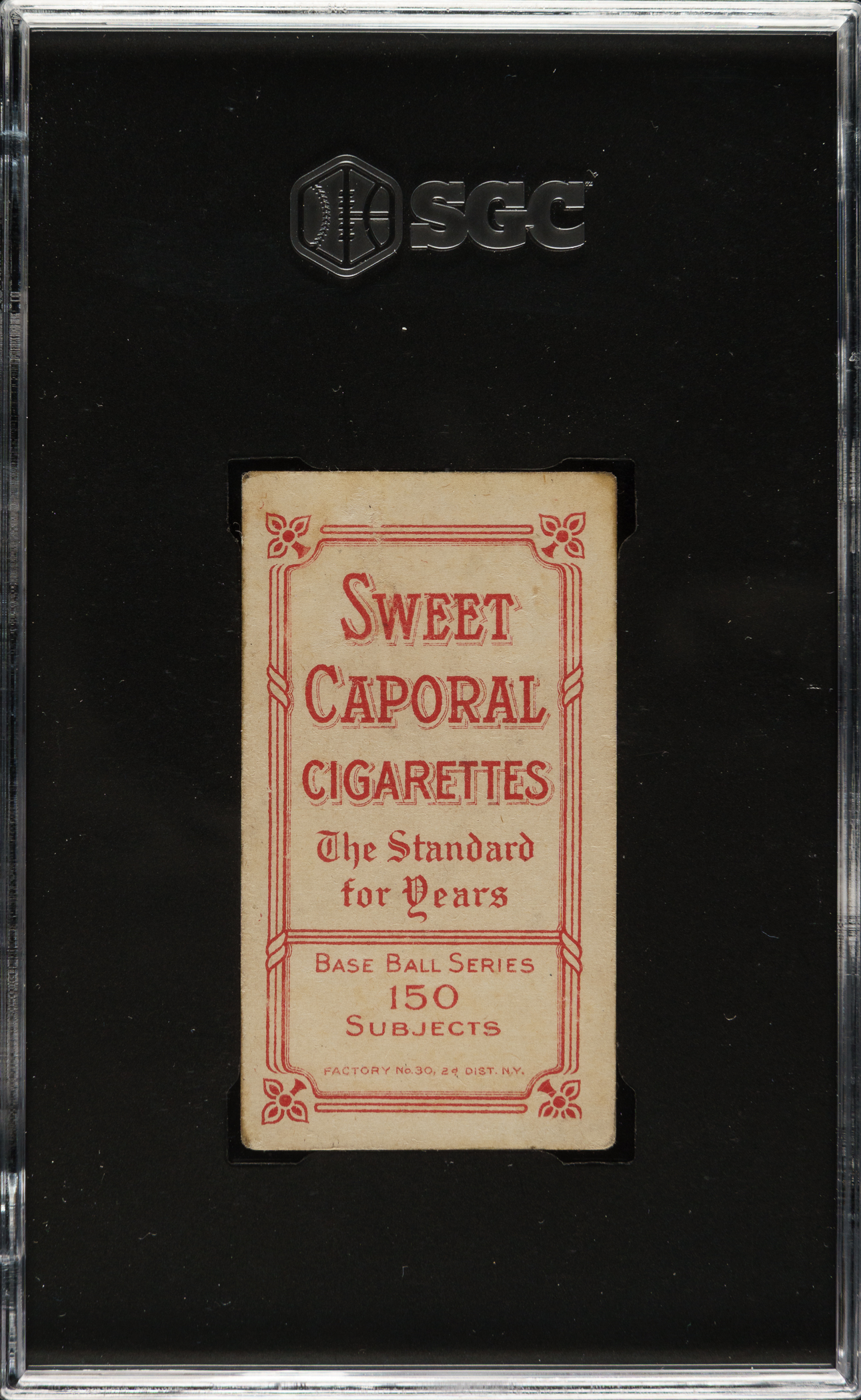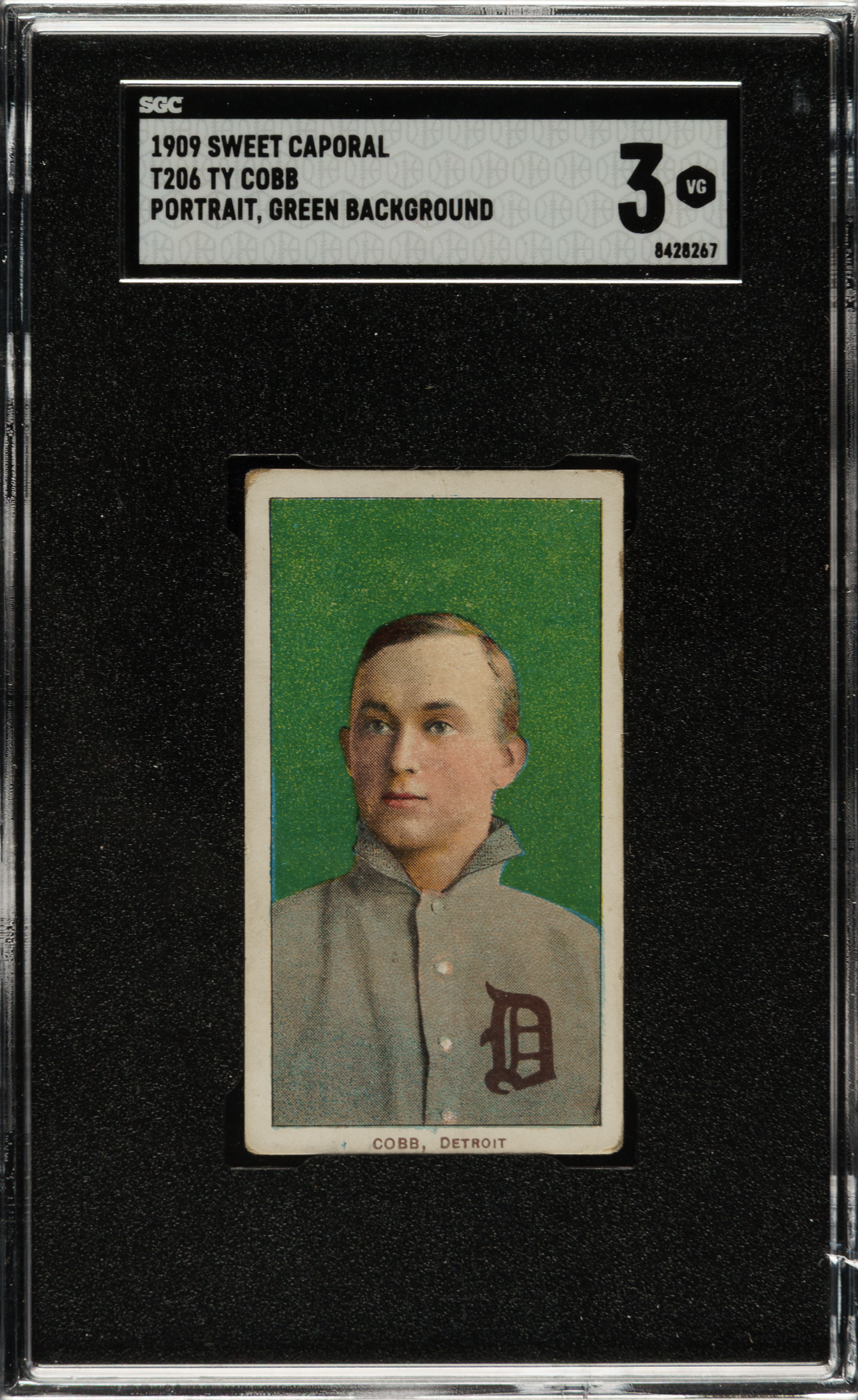 Graded VG 3 by SGC. Tremendous mid-grade example of this classic tobacco card of Hall of Famer Ty Cobb. The green-background pose is considered the rarest of the four poses of Cobb in the T206 set. The offered example has a beautiful green background, impressive registration, honest corner wear, and excellent centering. Boldly printed Sweet Caporal 150/30 advertising reverse. One of Cobb's most popular cards from the premier tobacco issue of the 1910 era.