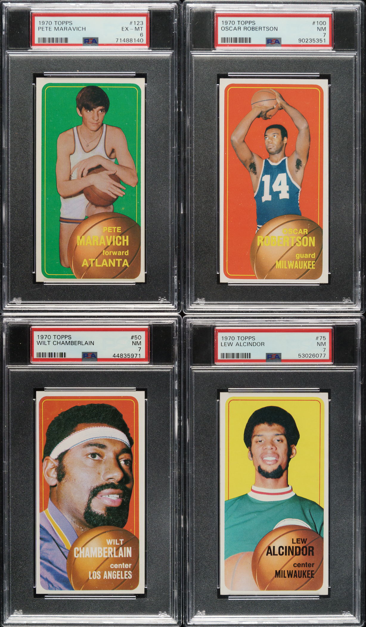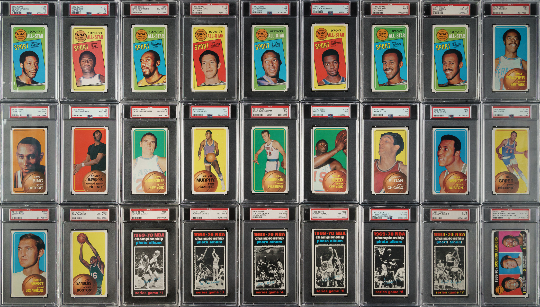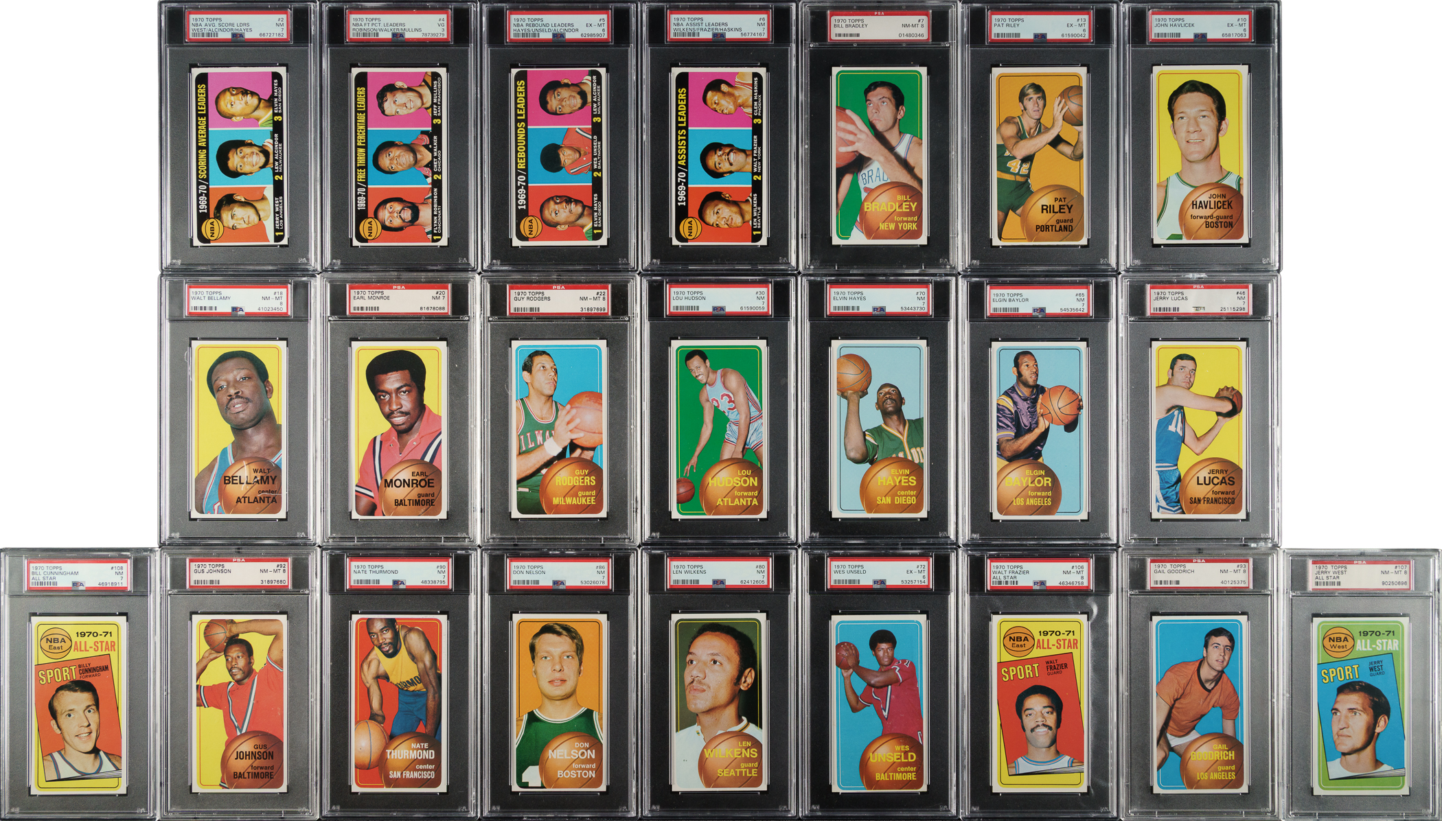 Complete 53-card subset of 1970-1971 Topps Hall of Fame Basketball cards (as required by the PSA Registry checklist), each professionally graded and encapsulated by PSA. Includes one duplicate #115 Hudson AS. PSA Grading Composite: NM-MT 8 (16 cards): #7 Bradley, 18 Bellamy, 22 Rodgers, 92 Johnson, 93 Goodrich, 106 Frazier AS, 107 West AS, 111 Thurmond AS, 125 Bing, 130 Hawkins, 135 DeBusschere, 155 Greer, 163 Sanders, 170 NBA Championship Gm 3 - DeBusschere, 171 NBA Championship Gm 4 - West, and 172 NBA Championship Gm 5 - Bradley. NM 7 (29 cards): #2 Scoring Avg Ldrs - West/Alcindor/Hayes, 6 Assist Ldrs - Wilkens/Frazier, 20 Monroe, 30 Hudson, 46 Lucas, 50 Chamberlain, 65 Baylor, 70 Hayes, 75 Alcindor, 80 Wilkens, 86 Nelson, 90 Thurmond, 100 Robinson, 108 Cunningham AS, 109 Hawkins AS, 110 Reed AS, 112 Havlicek AS, 113 Baylor AS, 114 Robertson AS, 115 Hudson AS, 120 Frazier, 137 Murphy RC, 140 Cunningham, 143 White RC, 148 Sloan RC, 150 Reed, 160 West, 168 NBA Championship Gm 1 - Reed, and 174 NBA Championship Gm 7 - Frazier. EX-MT 6 (8 cards): #1 Scoring Ldrs - Alcindor/West/Hayes, 5 Reb Ldrs - Hayes/Unseld/Alcindor, 10 Havlicek, 13 Riley RC, 72 Unseld, 115 Hudson AS, 123 Maravich RC, and 173 NBA Championship Gm 6 - Chamberlain. VG 3 (1 card): #4 FT % Ldrs - Mullins. Total: 54 cards (complete subset plus one duplicate). The size/weight of this item requires that there will be an additional shipping charge for this lot.
