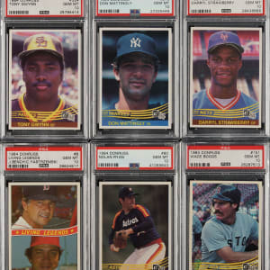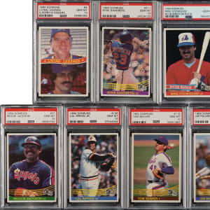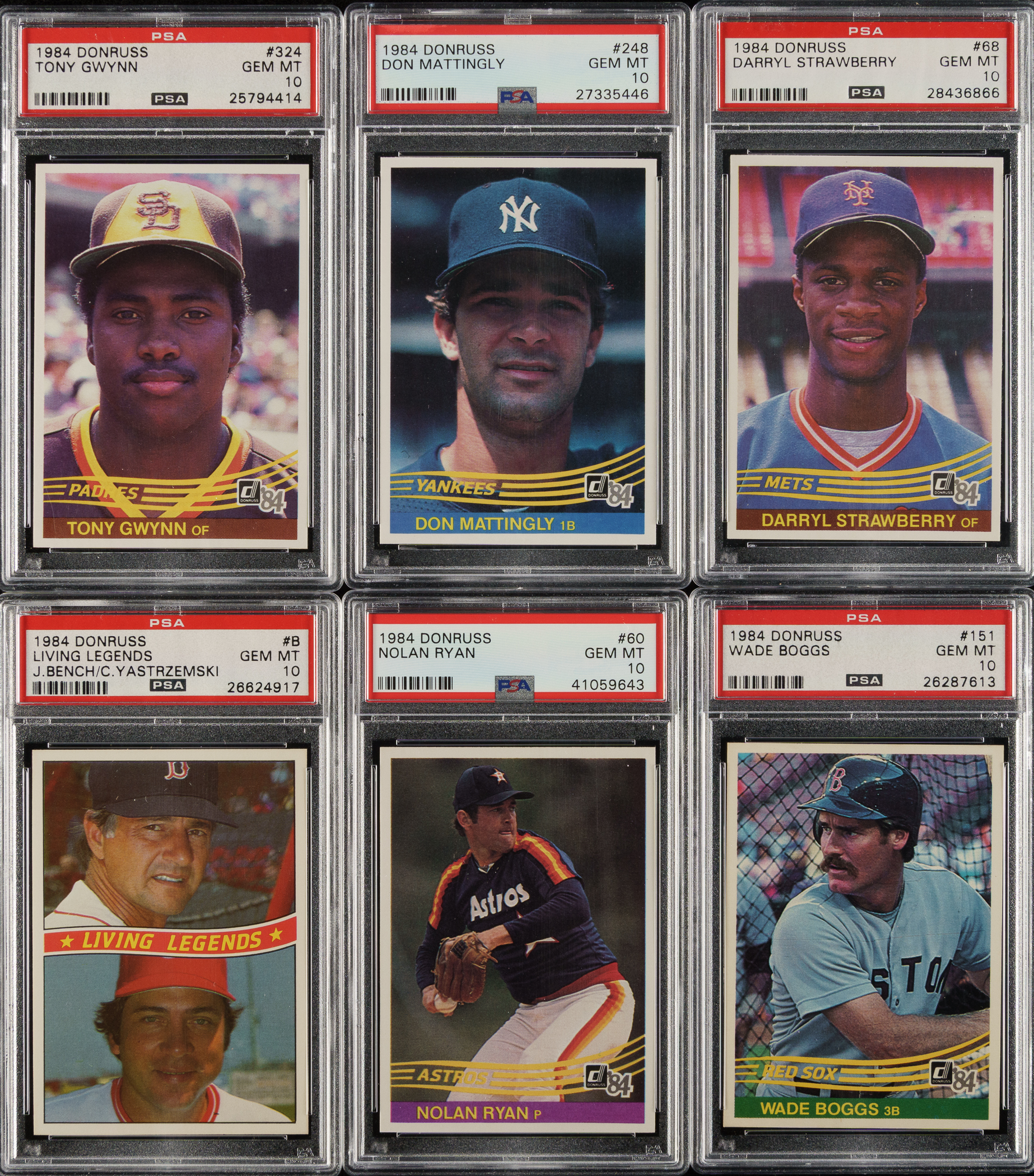 Presented is an extraordinary ULTRA high-grade near-complete set of 1984 Donruss baseball consisting of 489 of the 660 cards in the set, entirely graded and encapsulated GEM MINT 10 by PSA. The set, which is one of the most popular sets of the 1980s, includes rookie cards of Don Mattingly and Darryl Strawberry, and key cards of Nolan Ryan, Tony Gwynn, Wade Boggs, Ryne Sandberg, Cal Ripken, and Pete Rose. All the other stars of the day are also included. Also included are both living legends cards and both variations of #4, 9, 11, 13 and Stenhouse/no number on back. Card numbers 5, 7, 14, and 15 are Steele cards. Keys: #60 Ryan, 68 Strawberry RC, 106 Ripken, 151 Boggs, 248 Mattingly RC, 311 Sandberg and 324 Gwynn. Missing the following 171 cards for completion: #3, 8, 16, 21, 23, 24, 25, 28, 29, 30, 32, 33, 39, 40, 43, 67, 69, 74, 77, 89, 105, 109, 127, 128, 135, 138, 141, 142, 150, 152, 157, 159, 164, 165, 166, 168, 169, 184, 187, 190, 196, 197, 199, 203, 209, 210, 211, 219, 220, 221, 226, 227, 228, 229, 236, 238, 241, 249, 260, 261, 263, 266, 267, 270, 272, 282, 283, 287, 291, 300, 325, 350, 369, 380, 389, 394, 404, 405, 410, 412, 413, 425, 426, 428, 441, 442, 446, 448, 449, 453, 456, 457, 458, 463, 465, 470, 471, 472, 476, 478, 479, 480, 481, 482, 488, 489, 491, 497, 498, 501, 502, 504, 506, 509, 511, 513, 514, 518, 519, 521, 525, 526, 527, 528, 531, 535, 536, 537, 539, 540, 541, 542, 544, 545, 546, 547, 549, 550, 552, 553, 554, 555, 556, 558, 562, 564, 572, 574, 575, 580, 581, 582, 589, 590, 596, 598, 600, 603, 604, 609, 618, 624, 634, 636, 637, 642, 645, 646, 647, 649, and 650. This is a remarkably consistent and exceptional ULTRA high-grade near-complete set of this popular 1980s baseball-card issue. Total: 496 cards. The size/weight of this item requires that there will be an additional shipping charge for this lot.