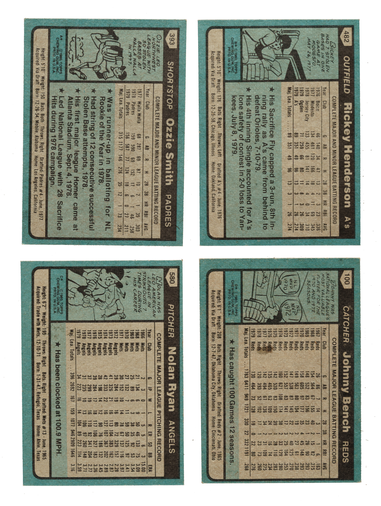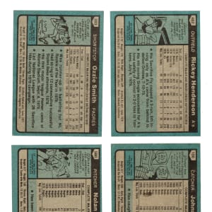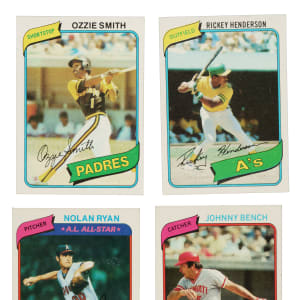 Complete 726-card set of 1980 Topps baseball cards. Condition is 42% Nr/Mt to Nr/Mt-Mt, 39% Ex to Ex-Mt, and 19% Vg to Vg-Ex (including a few lesser). Keys: #393 Smith (Ex+), 482 Henderson RC (Ex+), and 580 Ryan (Nr/Mt). Total: 726 cards. The size/weight of this item requires that there will be an additional shipping charge for this lot.