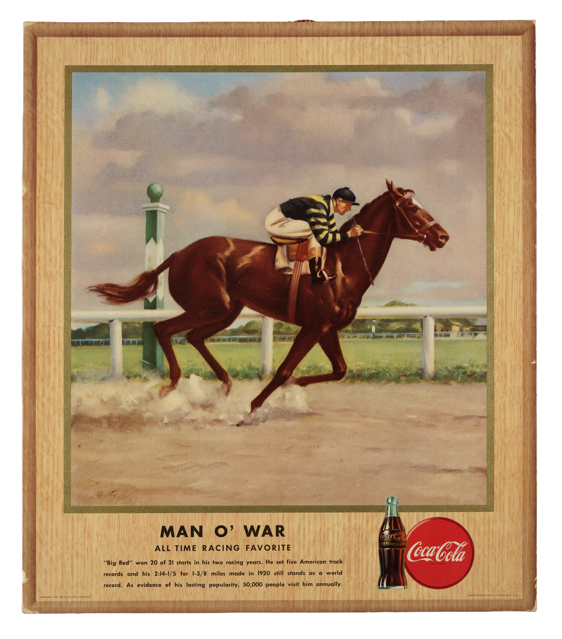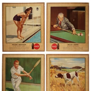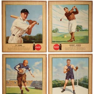 Presented is an extremely rare near-complete set of 1947 Coca-Cola advertising displays consisting of nine different signs (out of 10 in the set), missing only Ned Day (bowling) for completion. This set is highlighted by the fabled "Georgia Peach," Ty Cobb (technically Vg-Ex condition with a much stronger appearance). Extremely substantial and ideal for display as intended. This series of promotional advertising displays titled "All-Time Winners" was issued by Coca-Cola in 1947. In addition to Cobb, store displays from the series feature a number of other famous American sports legends, including Gene Tunney, Bobby Jones, and Red Grange. Cobb is without question the prize of the Coca-Cola advertising store displays issued in this series. Its stunning graphics and exceptional visual appeal notwithstanding, the offered set is also highly prized by collectors due to Cobb's long association with the company. Cobb was an early investor in Coca-Cola (its headquarters was located in Cobb's home state of Georgia) and later became one of the company's largest shareholders, earning him a seat on the board of directors. At the time of Cobb's death in 1961, his net worth was estimated at over $10 million, with much of that money having accrued from his Coca-Cola investments. Cobb first appeared in a Coca-Cola advertisement in 1907 and he continued as an active spokesperson for the remainder of his life. This is one of the few high-quality baseball Coca-Cola advertising displays ever produced. It is also one of the most striking Ty Cobb advertising displays produced by any company from any era. Each cardboard display (13 x 15 inches), which is complete with its original attached string on the reverse for hanging, has some minor corner and edge wear but is otherwise in Excellent condition overall, looking much as they did when first issued. This is an outstanding near-complete set (minus one) of these rare Coca-Cola displays, the first we have offered in the past 21 years! Total: 9 displays. The size/weight of this item requires that there will be an additional shipping charge for this lot.