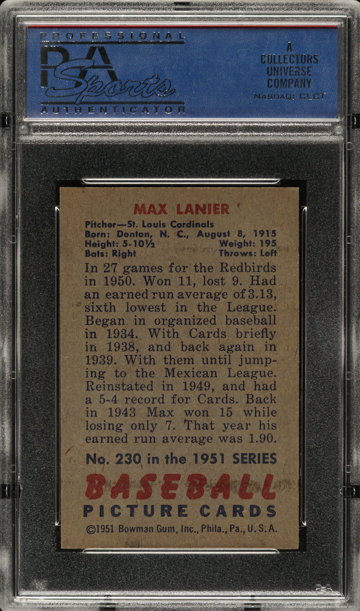 Lot # 2442: 1951 Bowman #230 Max Lanier PSA NM-MT 8