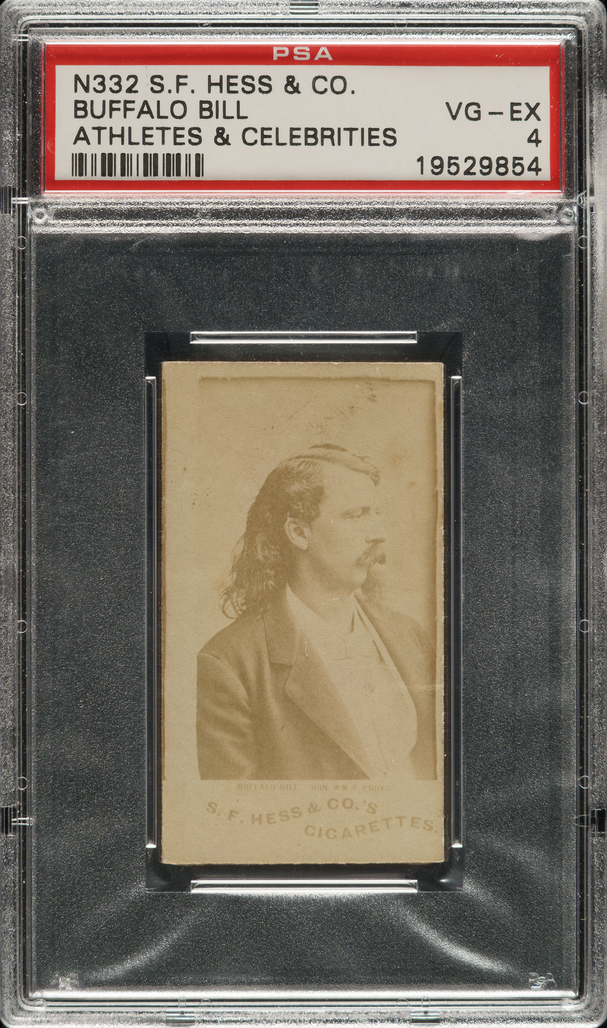 Graded VG-EX 4 by PSA. One of only two examples graded at this level with none higher! Rare type card from the 1888 N332 S. F. Hess “Athletes and Celebrities” set featuring legendary showman Buffalo Bill. This example presents extremely well (at a much higher-grade level!) with only a single crease responsible for the harsh technical grade. Clean front and back. This is a very attractive example featuring one of the most celebrated figures of the day from this classic nineteenth-century nonsport set.