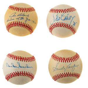 Collection of 40 single-signed baseballs consisting exclusively of former Brooklyn and/or Los Angeles Dodgers players. Unless otherwise noted, all the signatures appear on the sweet spot of an official National League baseball dating from the 1980s or later. The signatures have been scripted in a variety of inks. Most of the balls have varying degrees of age toning. Otherwise all are in Excellent to Mint or better condition overall. This collection features a wide variety of players spanning the 1940s to the 1990s. It is highlighted by numerous Hall of Famers and superstars. This collection consists of the following (if more than one, quantities are noted in parentheses): Hall of Famers (4): Herman, Koufax, Reese, and Snider. Non-Hall of Famers (36): Abrams (side panel), Branca, R. Barney (x2, both with inscriptions), Black (Rookie of the Year - 1952), B. Buckner (x2), Camilli, C. Connors, Erskine (x2, one side panel), Furillo, Garvey (x2, one with Best Wishes - MVP 74), K. Gibson, Gionfriddo, Hassett, F. Howard (side panel), Labine (x2, one side panel), Lavagetto (x2), Loes (x2), Newcombe (x2, one side panel), M. Owen, Pafko, Podres (x3), B. Powell, Shuba, Whitman (Brooklyn Dodgers), and M. Wills (x2, one with 104 Steals). Total: 40 signed baseballs. Auction LOA from James Spence/JSA. The size/weight of this item requires that there will be an additional shipping charge for this lot.
