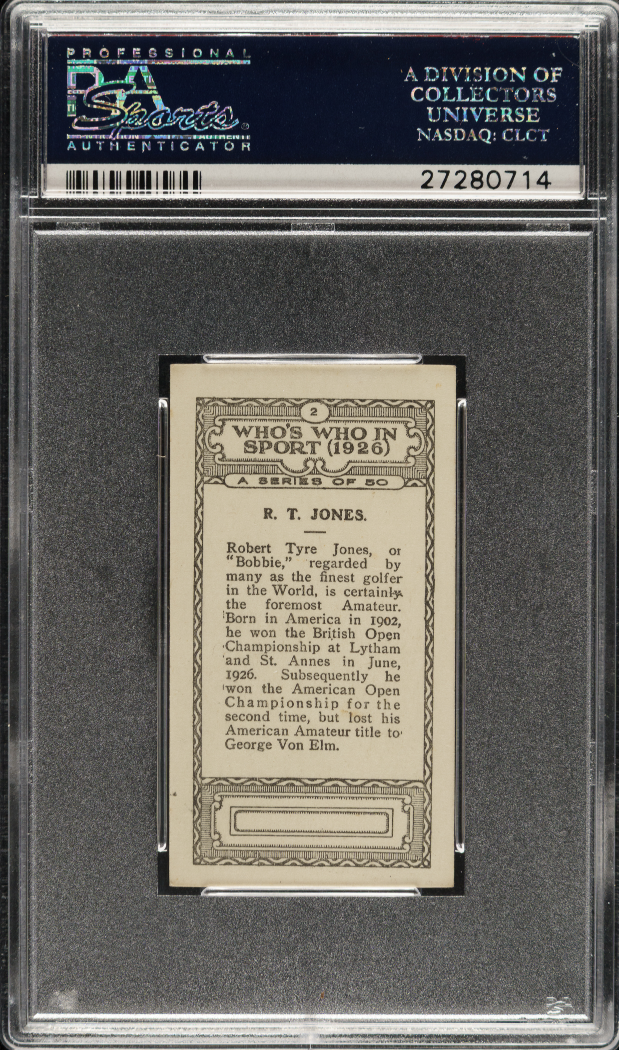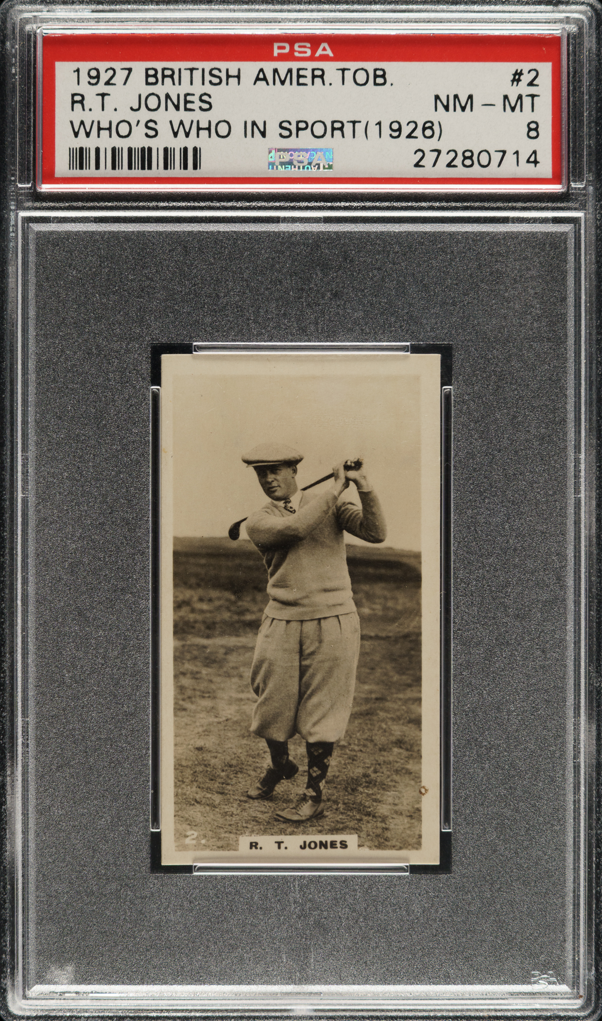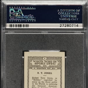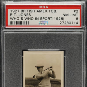 Graded NM-MT 8 by PSA. Only two examples graded higher by PSA. Extraordinary high-grade example of Hall of Famer Bobby Jones from the British American Tobacco "Who's Who In Sport" series, issued in 1927. It is interesting to note that the image of Jones used on this card is the same image used on Jones' rookie card from the 1926 Lambert & Butler series. In fact, the entire set is identical (front and back) to the 1926 Lambert & Butler series, with the only difference being there is no company advertisement for Lambert & Butler on the bottom of the reverse. Bright, crisp, and clean, both front and back, with strong corners, and outstanding contrast.