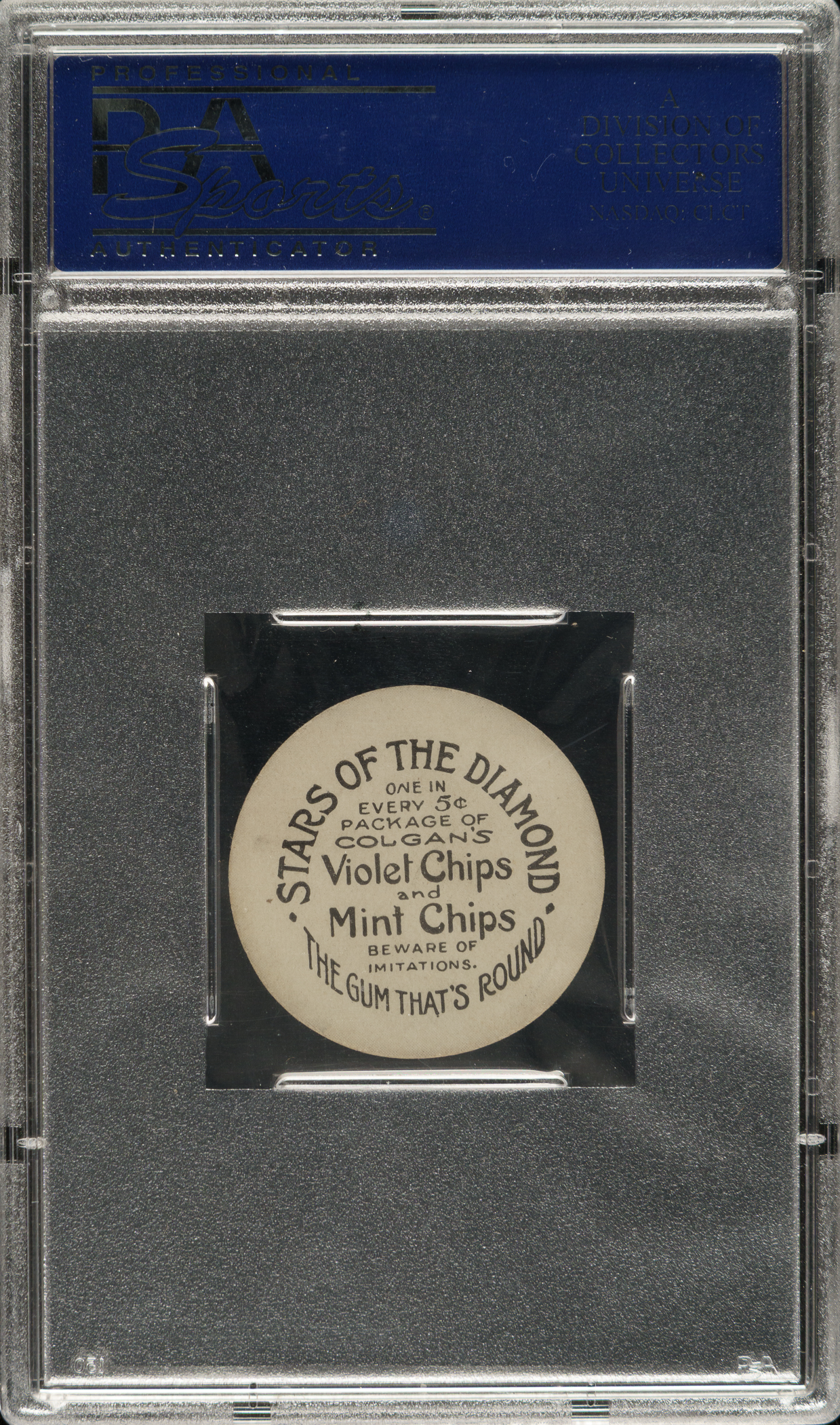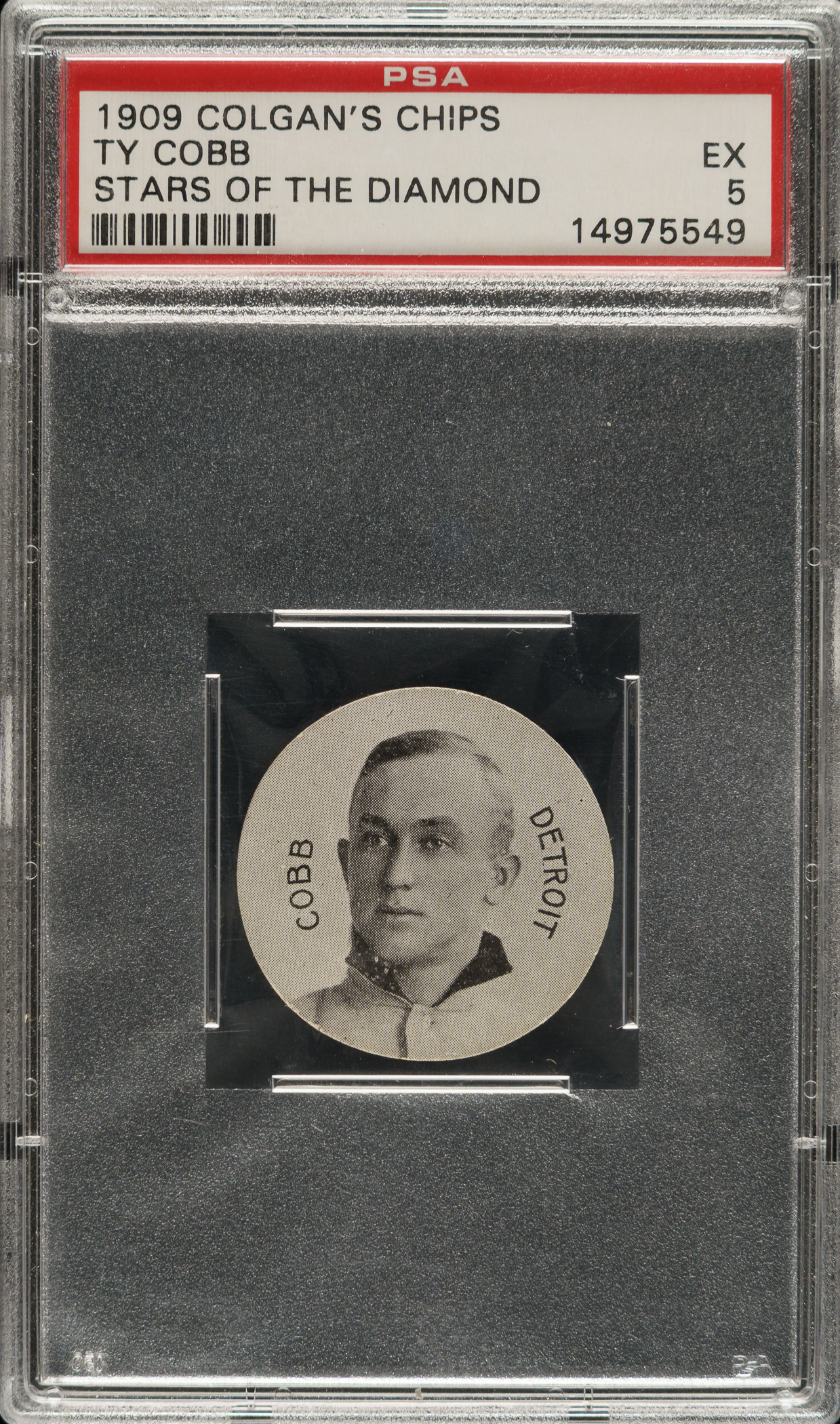 Graded EX 5 by PSA. Beautiful E254 Colgan’s Chips card of Ty Cobb. This is one of Cobb's most unusual and striking cards. This card is also noteworthy as it features the same Carl Horner portrait as appears on Cobb's T206 card. Crisp and clean with a flawless image. Boldly printed advertisement on the reverse. Cobb, of course, is one of the key stars of the set. This is a fantastic mid-grade example of one of Ty Cobb’s most classic and unusual cards, from one of vintage-card collecting's most distinctive sets.