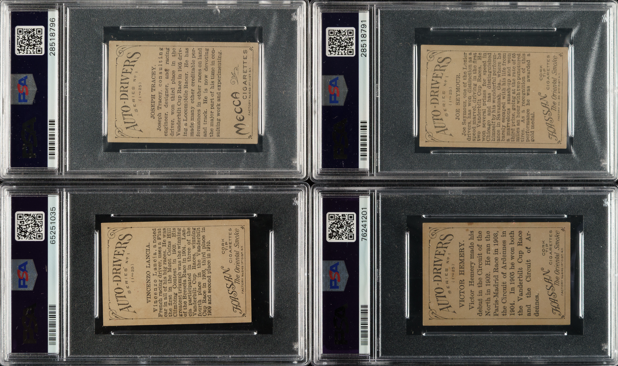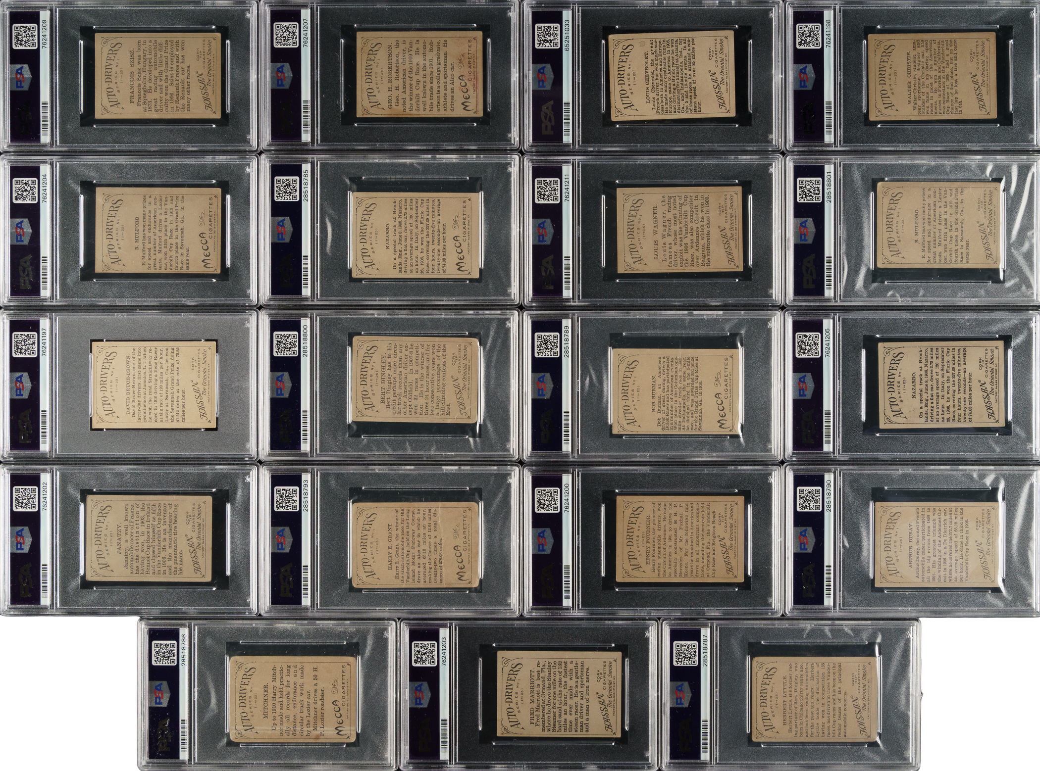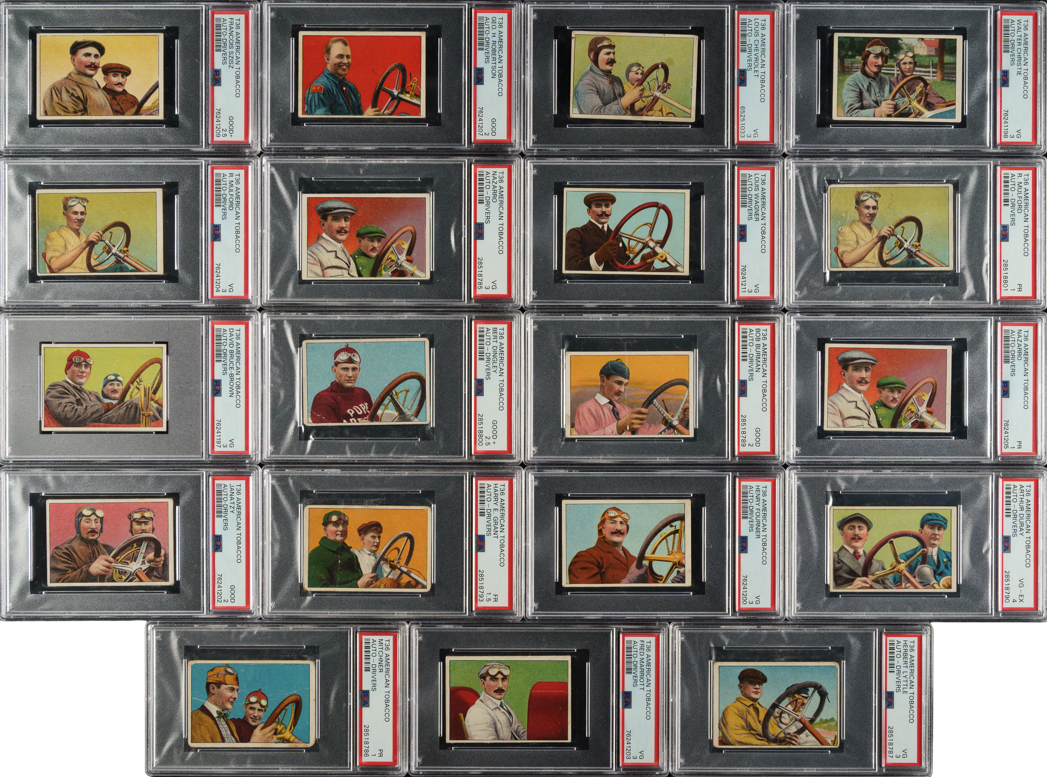 Offered is a near-complete set (21 of 25) of 1910 T36 Hassan/Mecca "Auto-Drivers" cards, entirely graded and encapsulated by PSA. Includes two duplicates (Mulford and Nazarro). Missing four cards for completion (Demoget, Oldfield, Palma, and Strang). Issued with Hassan or Mecca Cigarettes, each card features a beautifully rendered multicolor illustration of a legendary race car driver or automobile pioneer, including famous names like Louis Chevrolet. The reverse displays a brief description of the featured subject. PSA Grading Composite: EX 5 (1 card): Lancia. VG-EX+ 4.5 (1 card): Tracey. VG-EX 4 (3 cards): Duray, Hemery, and Seymour. VG 3 (8 cards): Chevrolet, Christie, Fournier, Lyttle, Marriott, Mulford, Nazarro, and Wagner. GOOD+ 2.5 (2 cards): Dingley and Szisz. GOOD 2 (4 cards): Burman, Bruce-Brown, Janatzy, and Robertson. FAIR 1.5 (1 card): Grant. POOR 1 (3 cards): Mitchner, Mulford, and Nazarro. This 1910 automobile-related set is one of the era's most popular nonsport tobacco-card issues. Total: 23 cards (set of 21 plus two duplicates). The size/weight of this item requires that there will be an additional shipping charge for this lot.