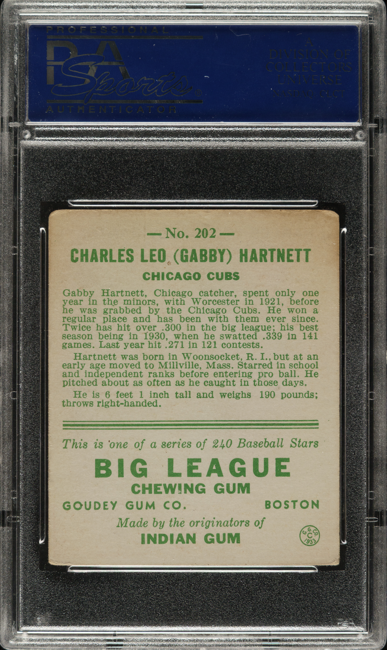 Graded VG-EX 4 by PSA. Chicago Cubs Hall of Famer Gabby Hartnett.