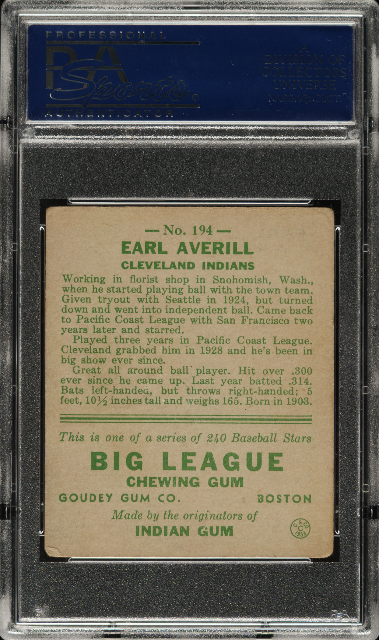 Graded VG 3 by PSA. Cleveland Indians Hall of Famer Earl Averill.