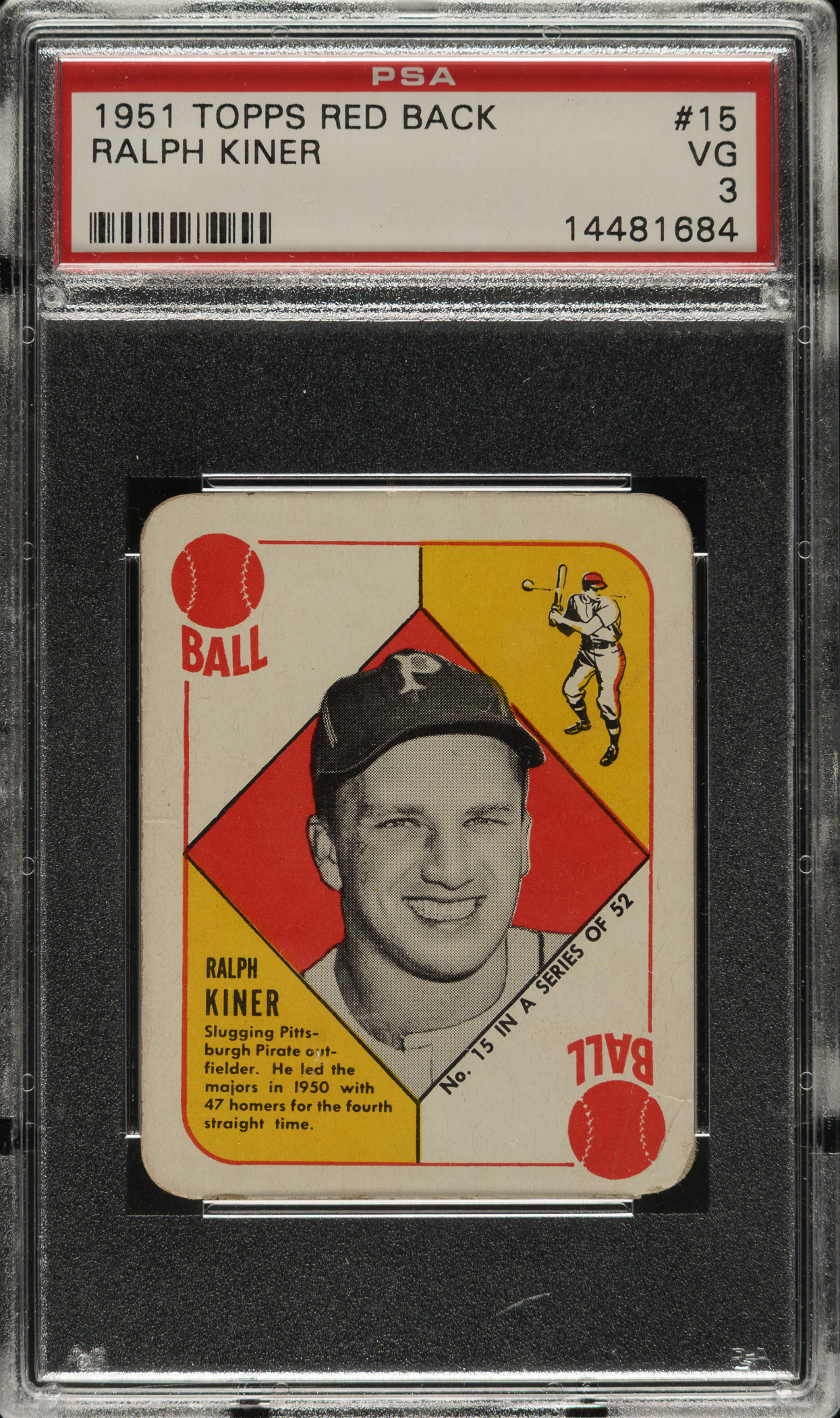 Graded VG 3 by PSA. Pittsburgh Pirates Hall of Famer Ralph Kiner.