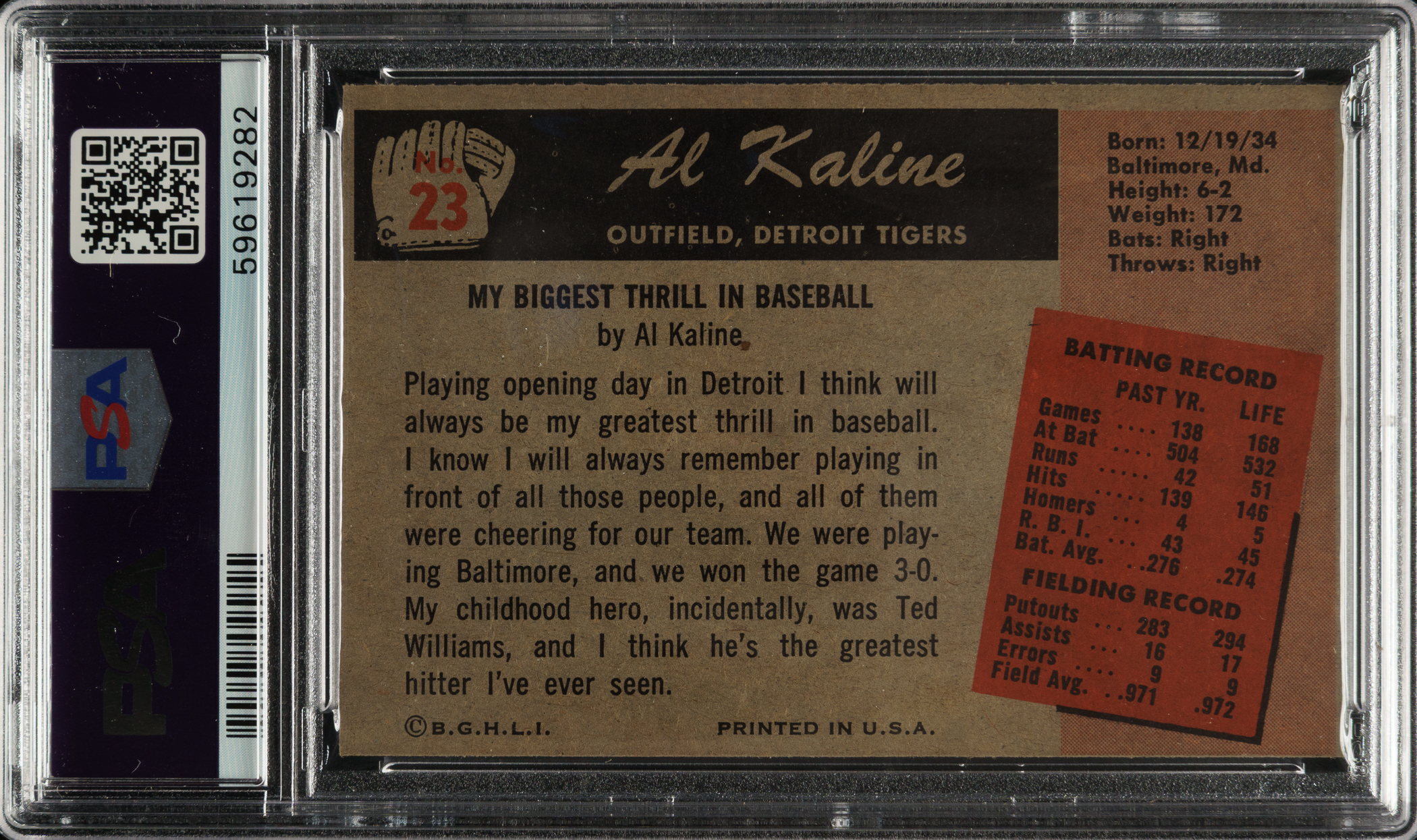 Graded NM 7 by PSA. Detroit Tigers Hall of Famer Al Kaline.
