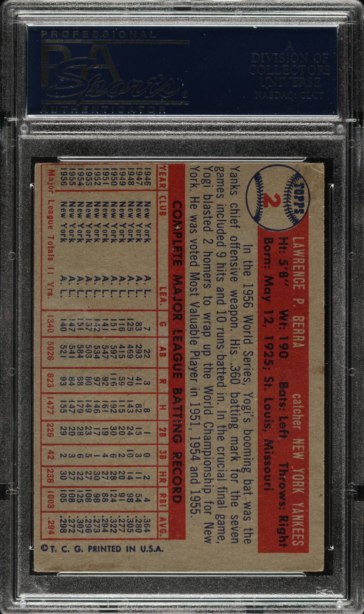 Lot # 2737: 1957 Topps #2 Yogi Berra PSA VG-EX 4