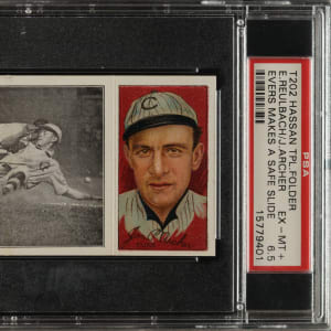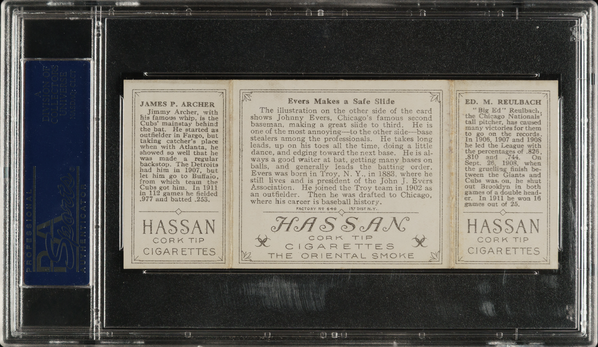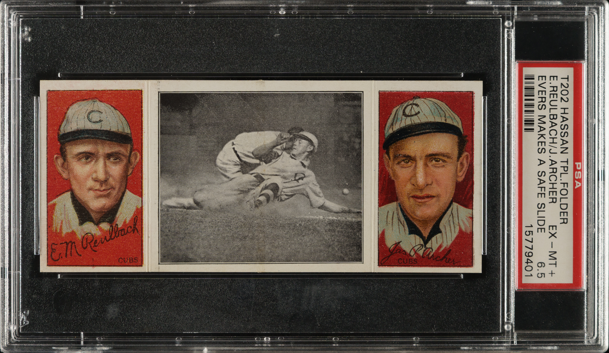 Lot # 1711: 1912 T202 Hassan Triple Folder "Evers Make A Safe Slide" Archer/Reulbach PSA EX-MT+ 6.5