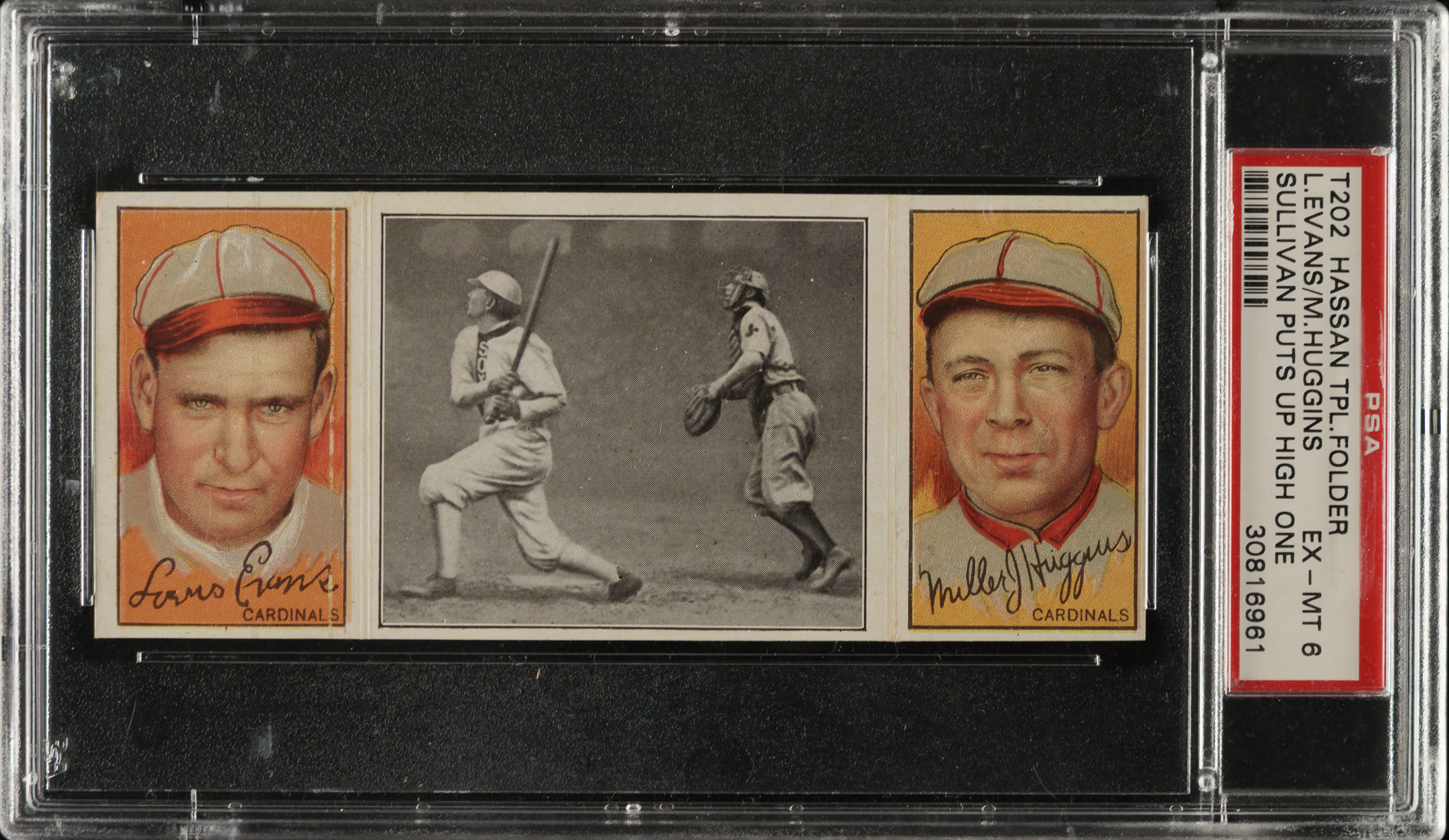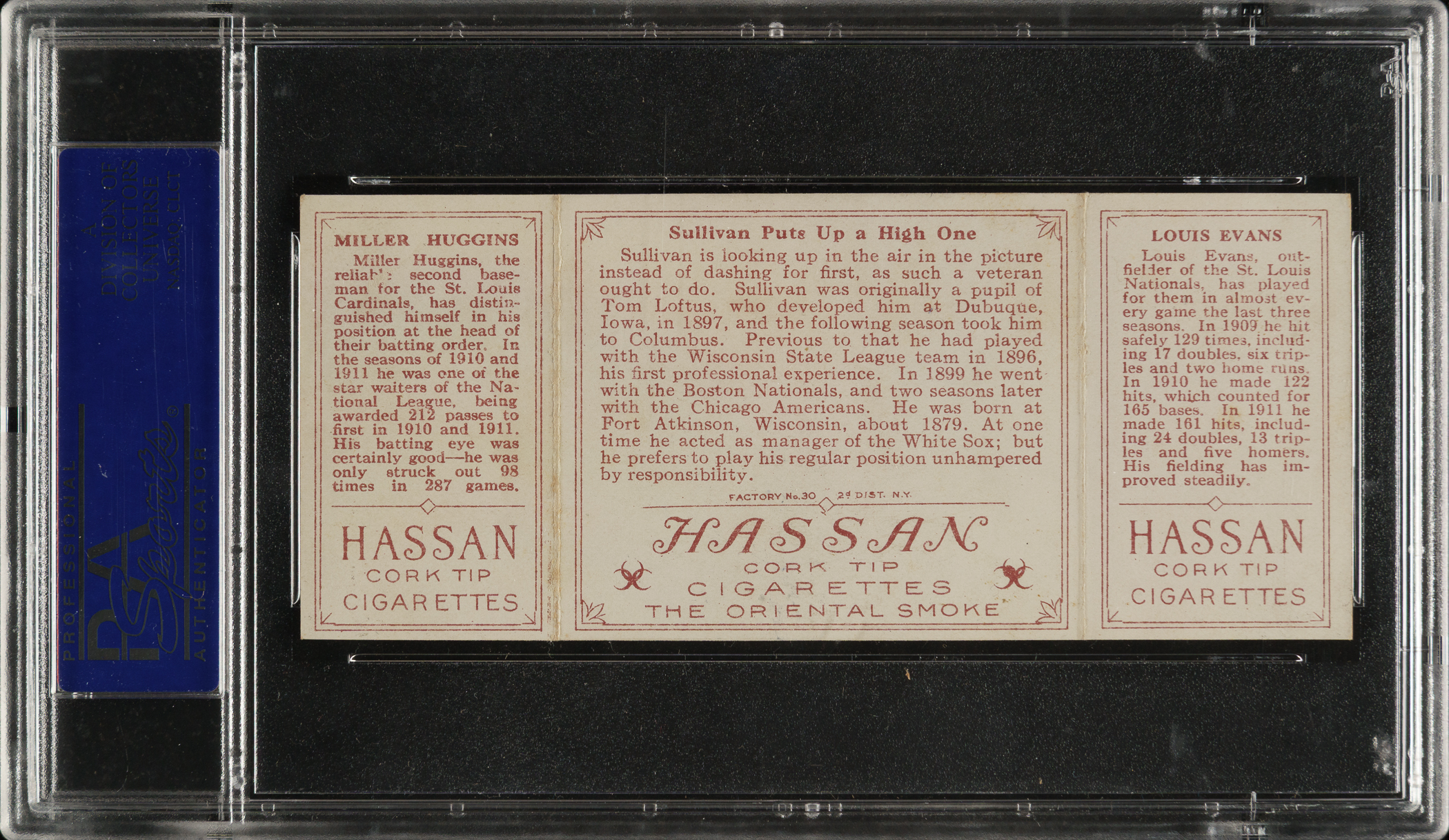 Lot # 1792: 1912 T202 Hassan Triple Folder "Sullivan Puts Up a High One" Evans/Miller Huggins PSA EX-MT 6