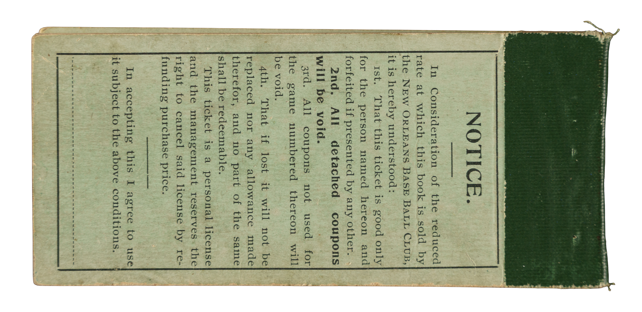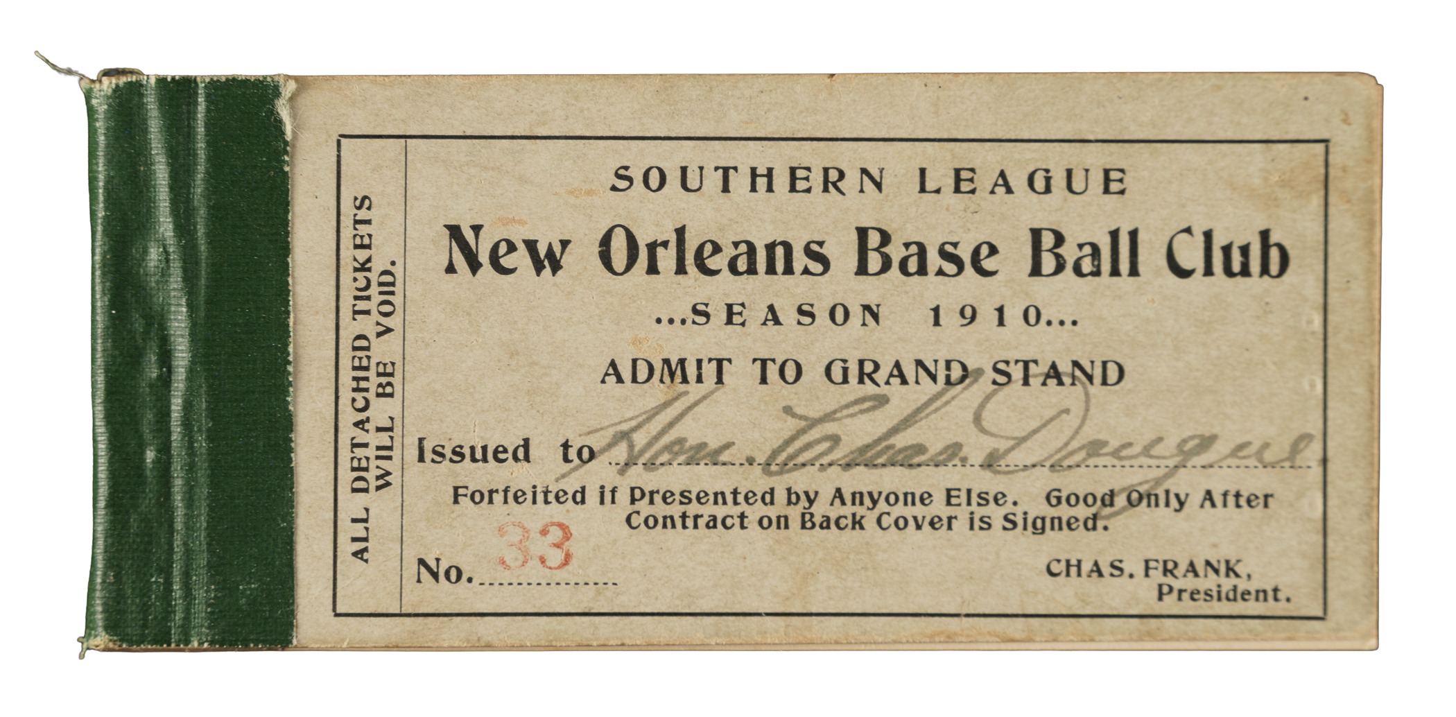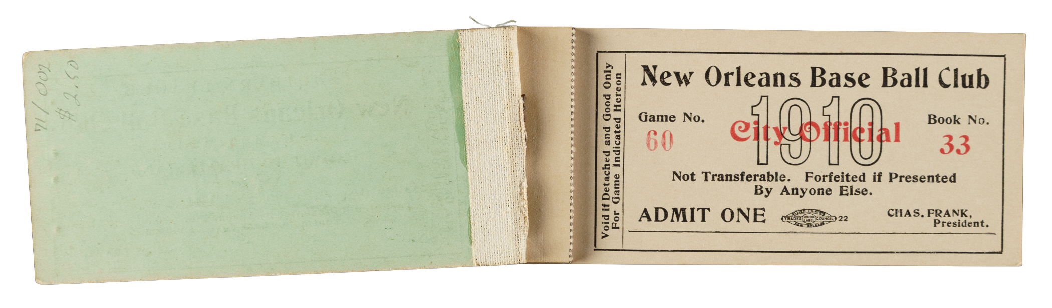 Rare ticket book, containing 11 unused tickets, issued by the New Orleans Base Ball Club for the club's 1915 season. As noted on the front cover, this is season-ticket book number "33" and was issued to "Hon. Chas. Dugas," a city official. The 11 that remain are for games 60 through 70. These tickets would have granted the bearer the opportunity to watch a young outfielder for the New Orleans Pelicans by the name of Joe Jackson. 1910 marked the only season "Shoeless Joe" was with New Orleans, and it was certainly a memorable one as he led the Southern Association in batting average (.354), hits (165), and runs (82). The book (4.5 x 2 inches) displays moderate wear, with several tiny surface indentations and abrasions visible on the front and back covers. In Good condition overall. Each of the 11 tickets (3.75 x 2 inches) remains firmly attached to the spine and is in Near Mint condition.