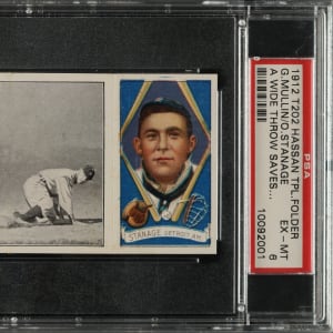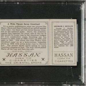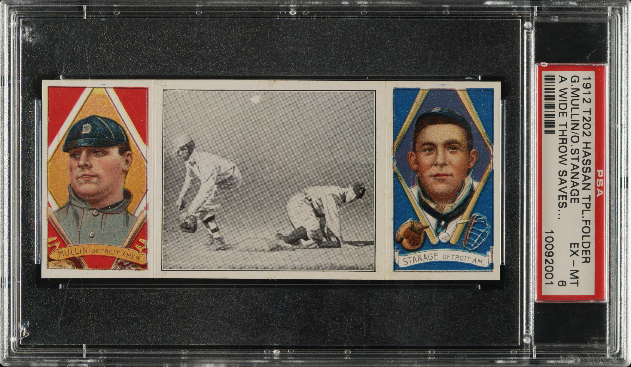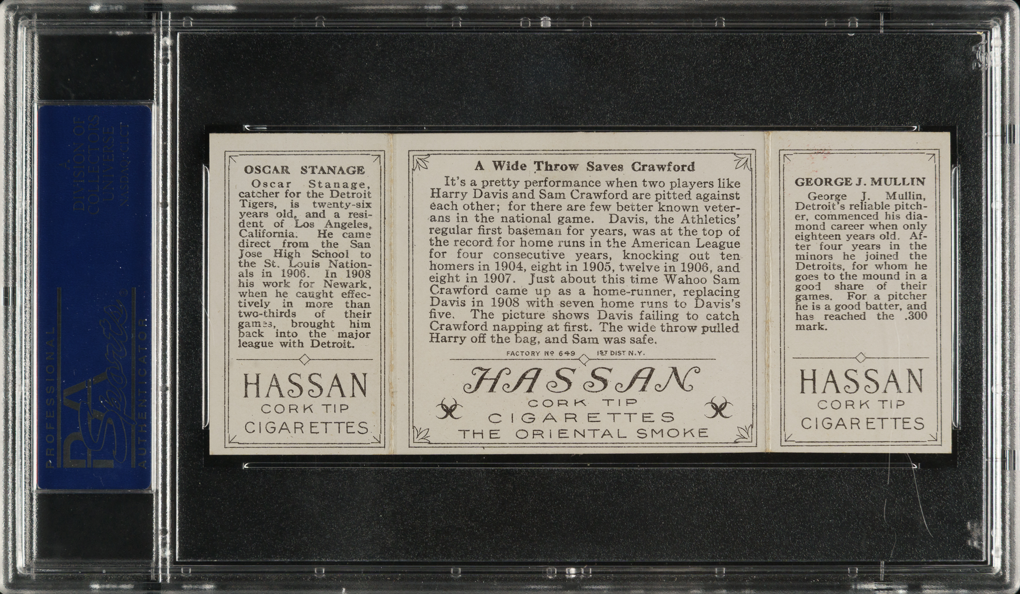 Lot # 1691: 1912 T202 Hassan Triple Folder "A Wide Throw Saves Crawford" Stanage/Mullin PSA EX-MT 6