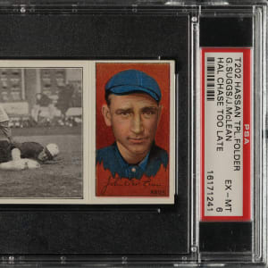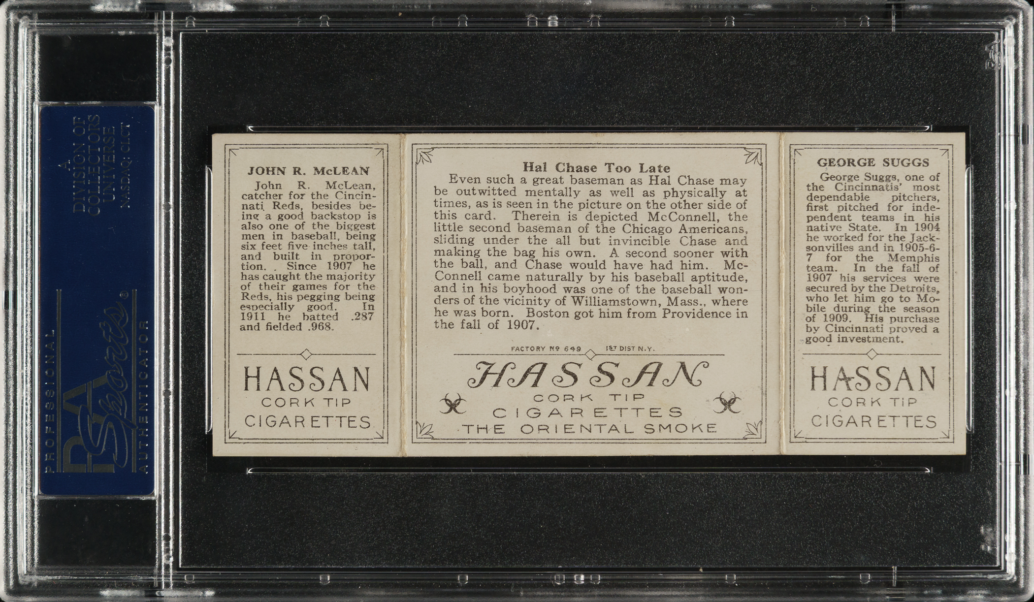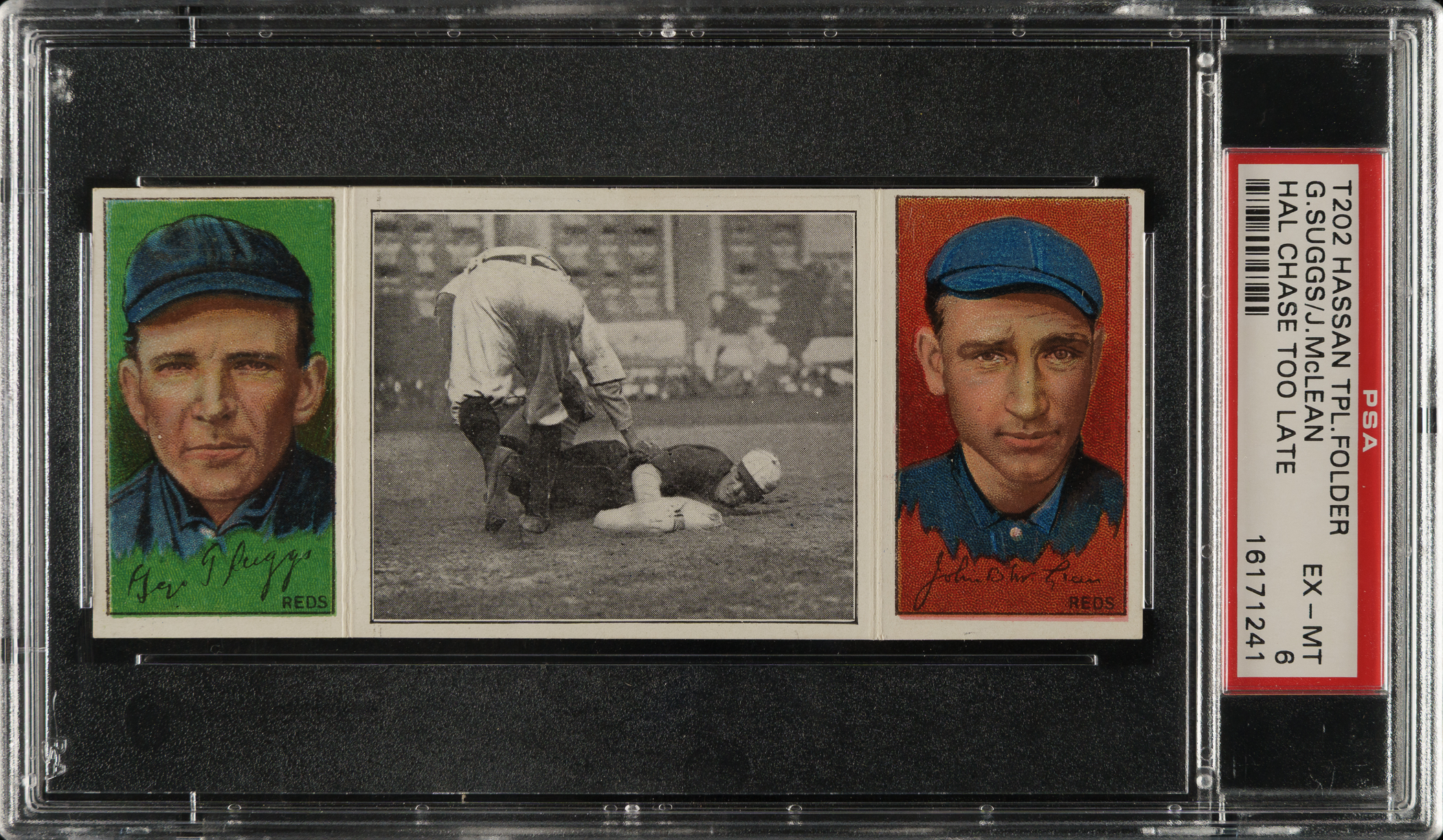 Lot # 1726: 1912 T202 Hassan Triple Folder "Hal Chase Too Late" Suggs/McLean PSA EX-MT 6