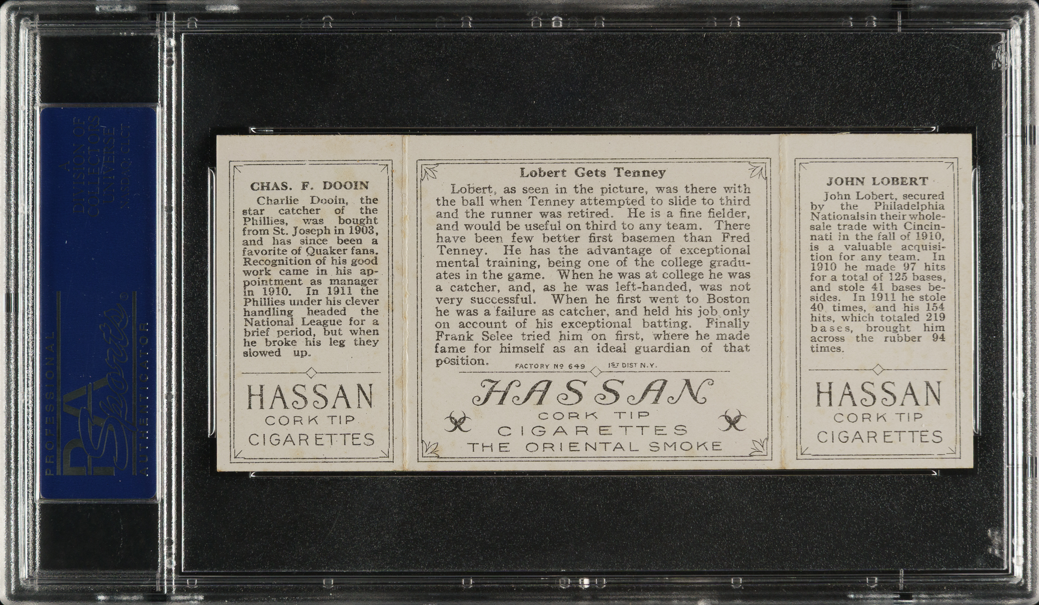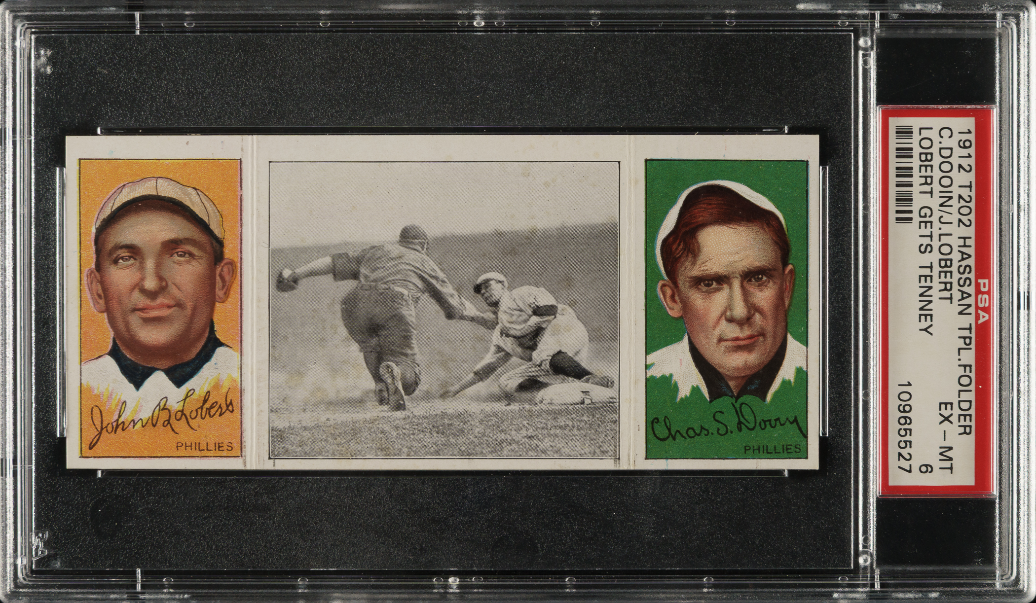 Lot # 1760: 1912 T202 Hassan Triple Folder "Lobert Gets Tenney" Lobert/Dooin PSA EX-MT 6