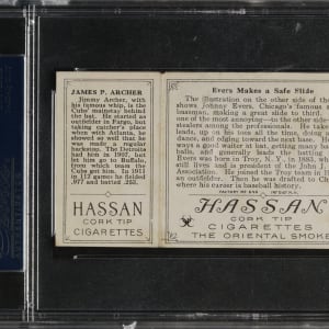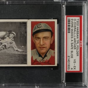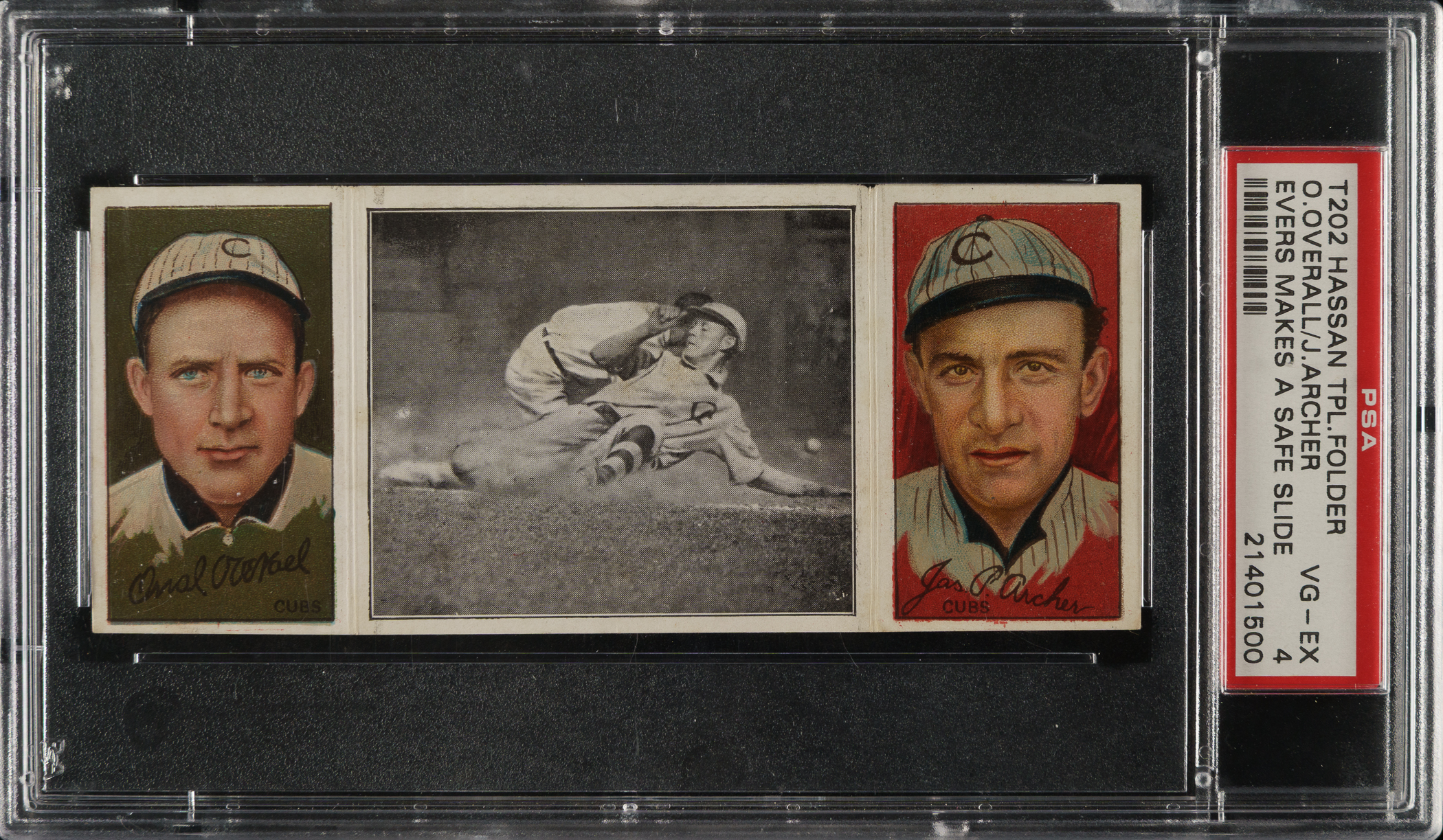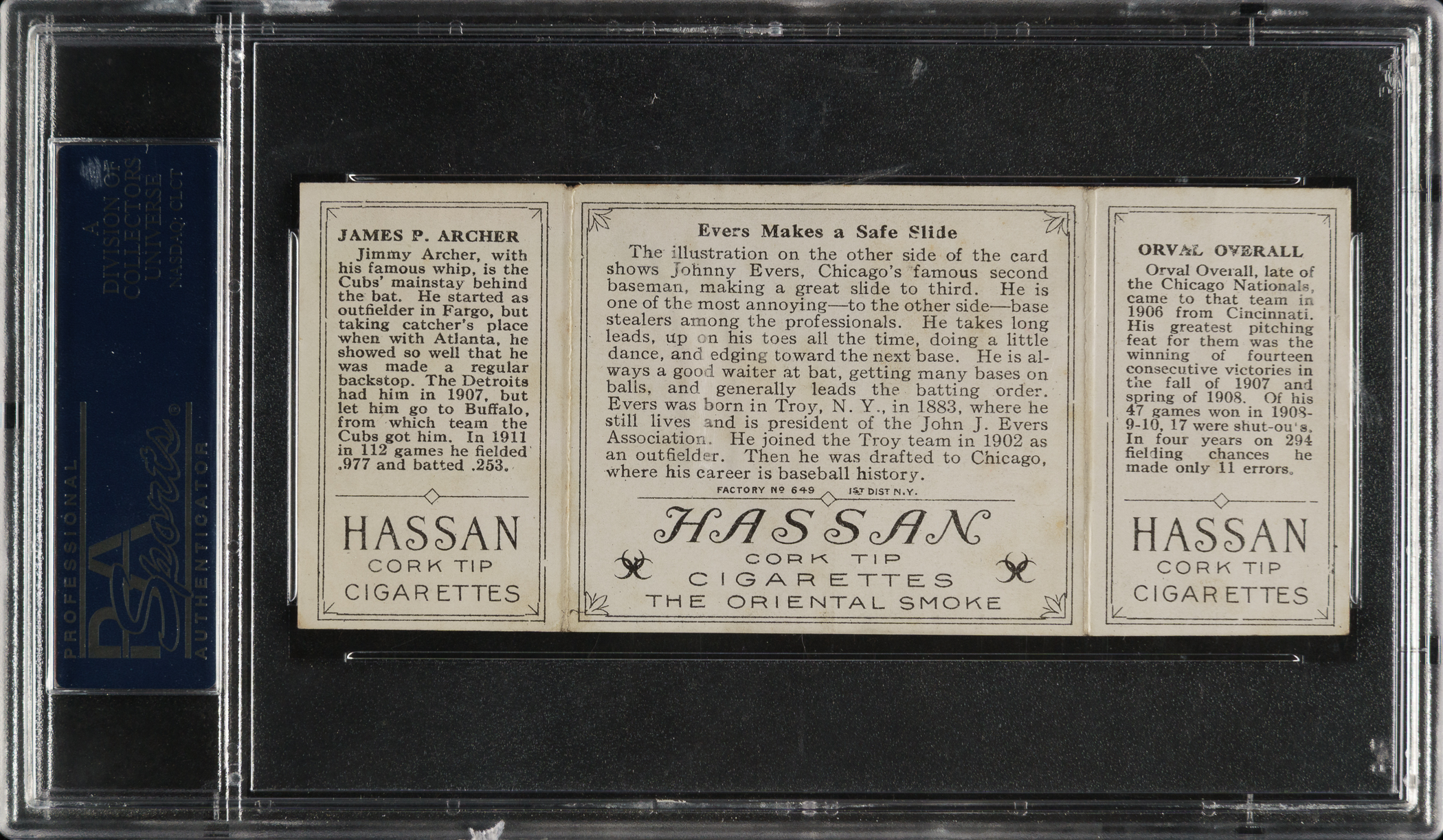 Lot # 1713: 1912 T202 Hassan Triple Folder "Evers Makes A Safe Slide" Archer/Overall PSA VG-EX 4