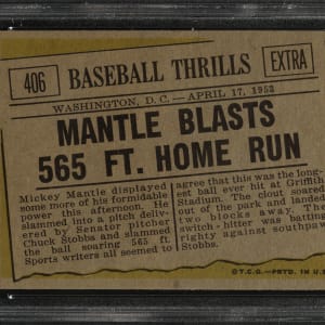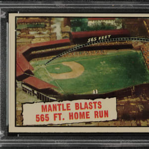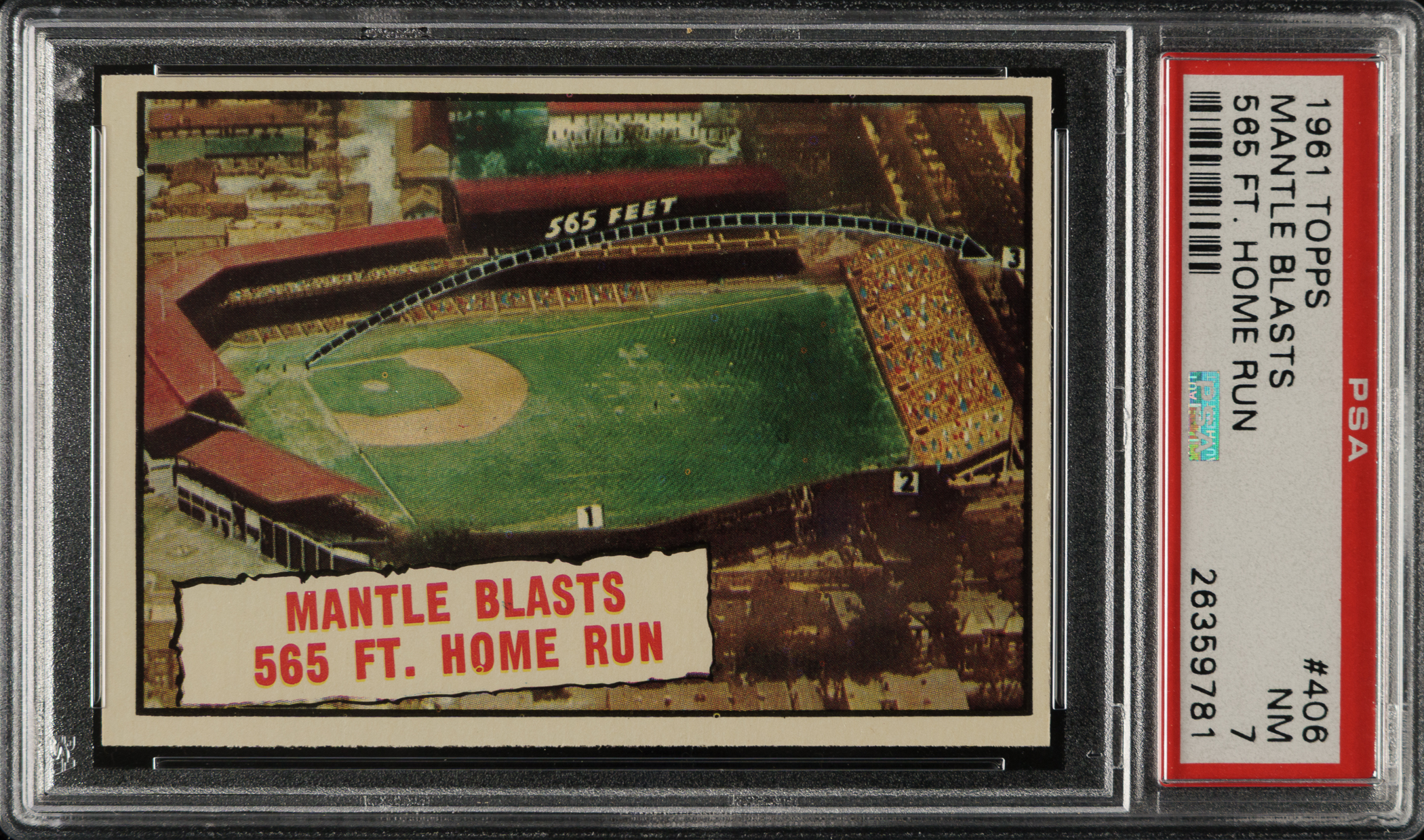 Lot # 2908: 1961 Topps #406 Mantle Blasts 565 Ft. Home Run PSA NM 7