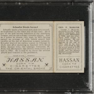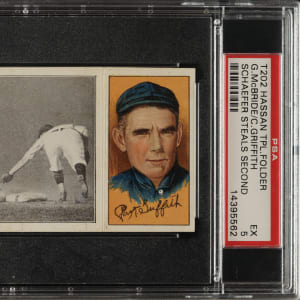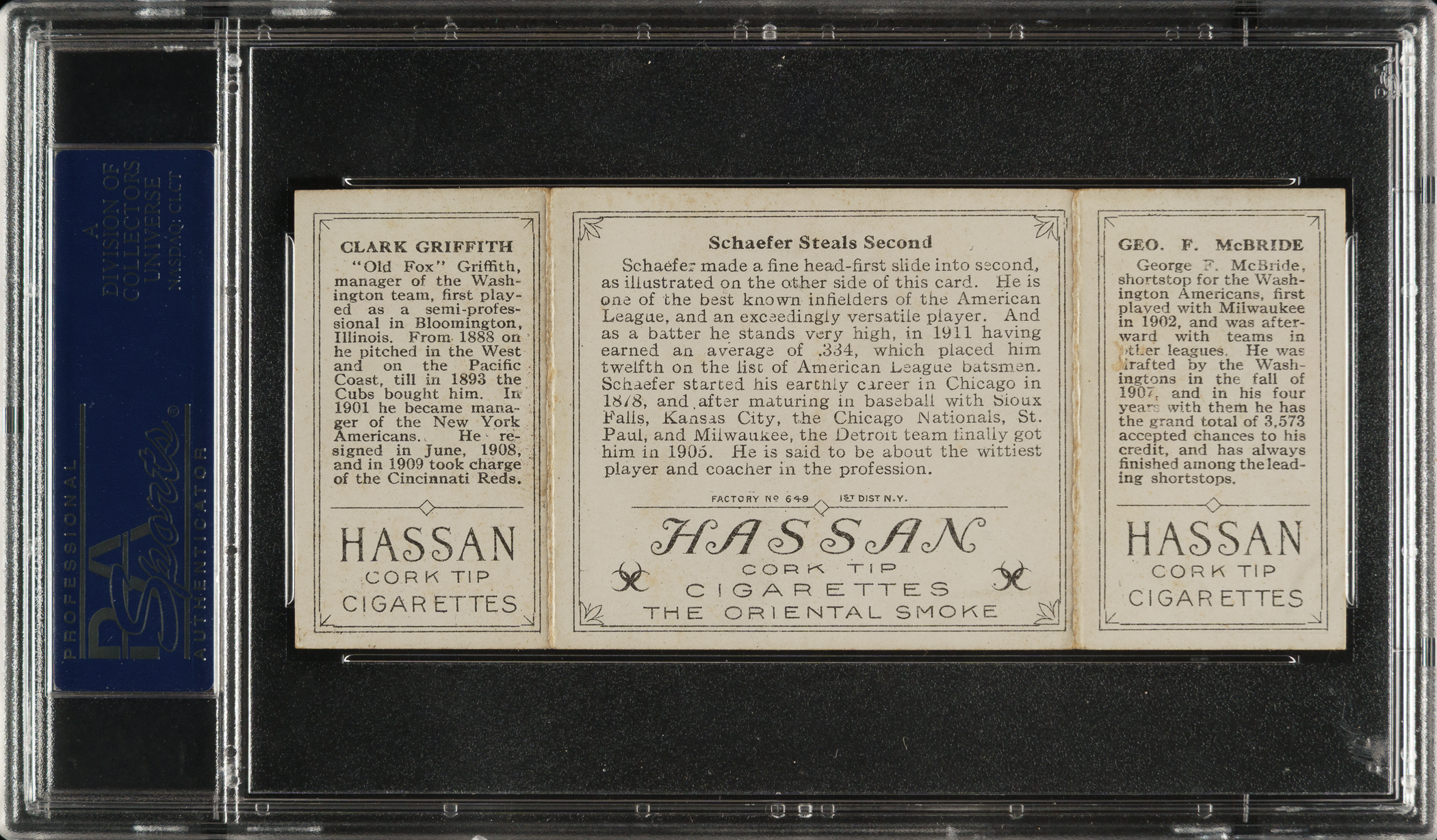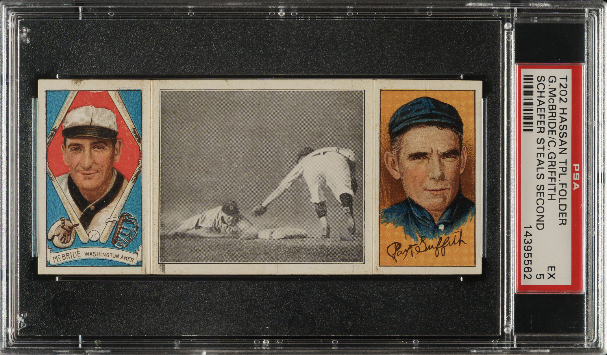 Lot # 1776: 1912 T202 Hassan Triple Folder "Schaefer Steals Second" Clark Griffith/McBride PSA EX 5