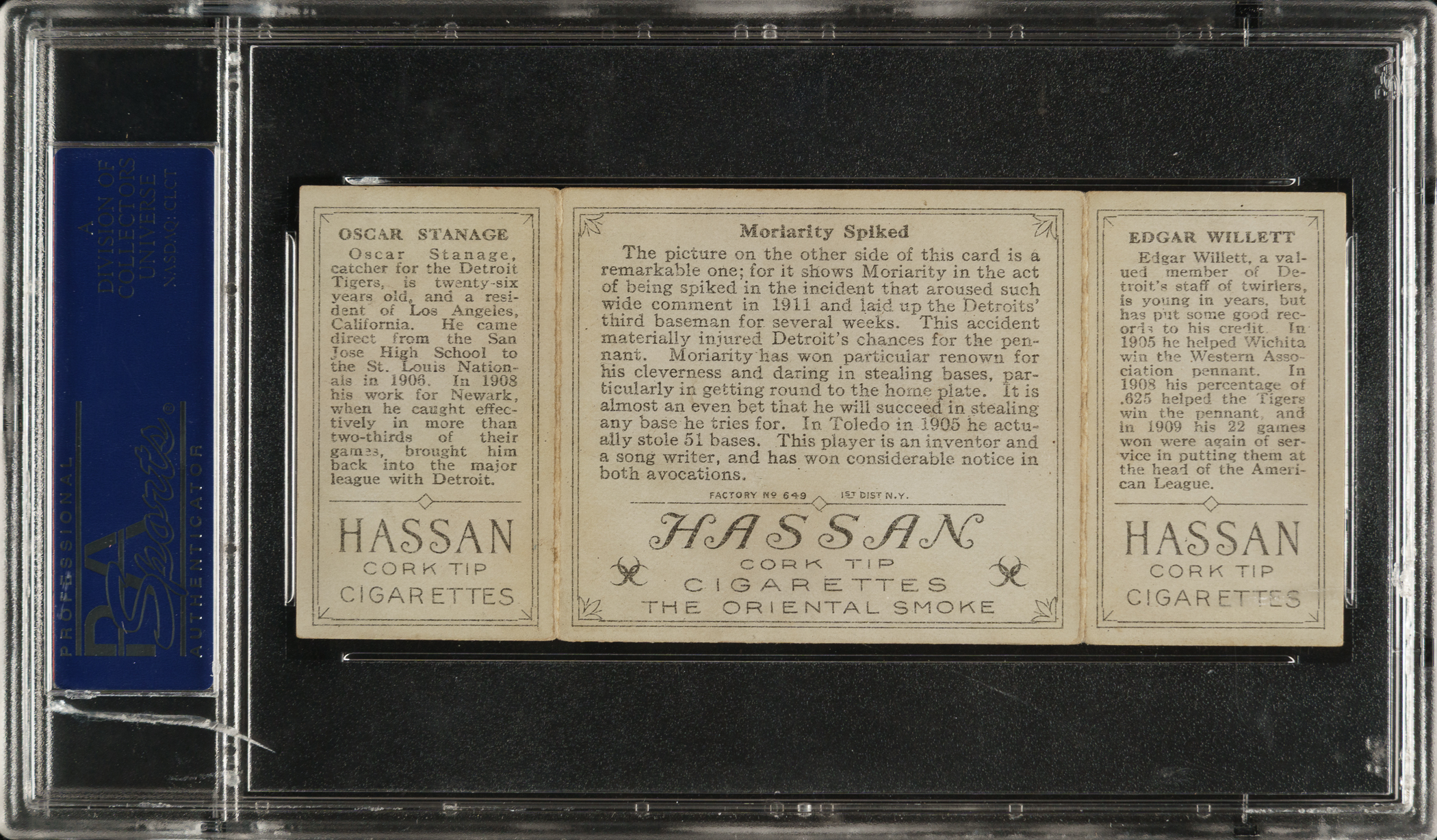 Lot # 1765: 1912 T202 Hassan Triple Folder "Moriarity Spiked" Willett/Stanage PSA EX 5