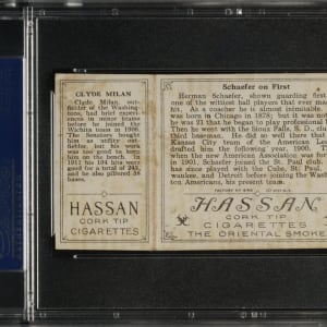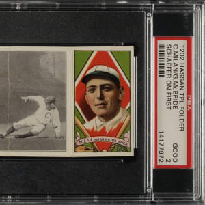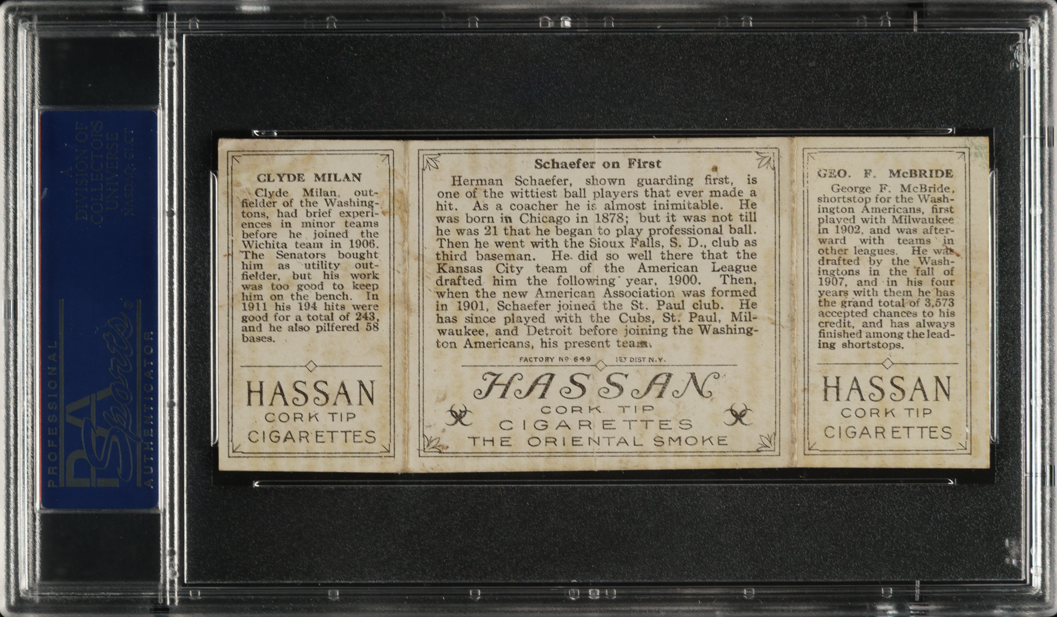 Lot # 1775: 1912 T202 Hassan Triple Folder "Schaefer on First" McBride/Milan PSA GOOD 2