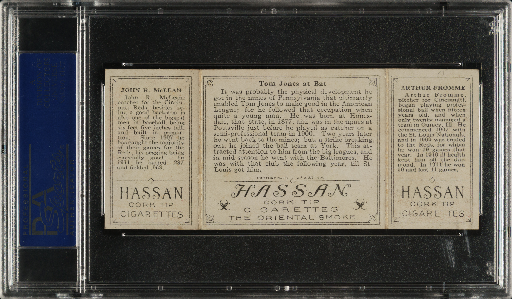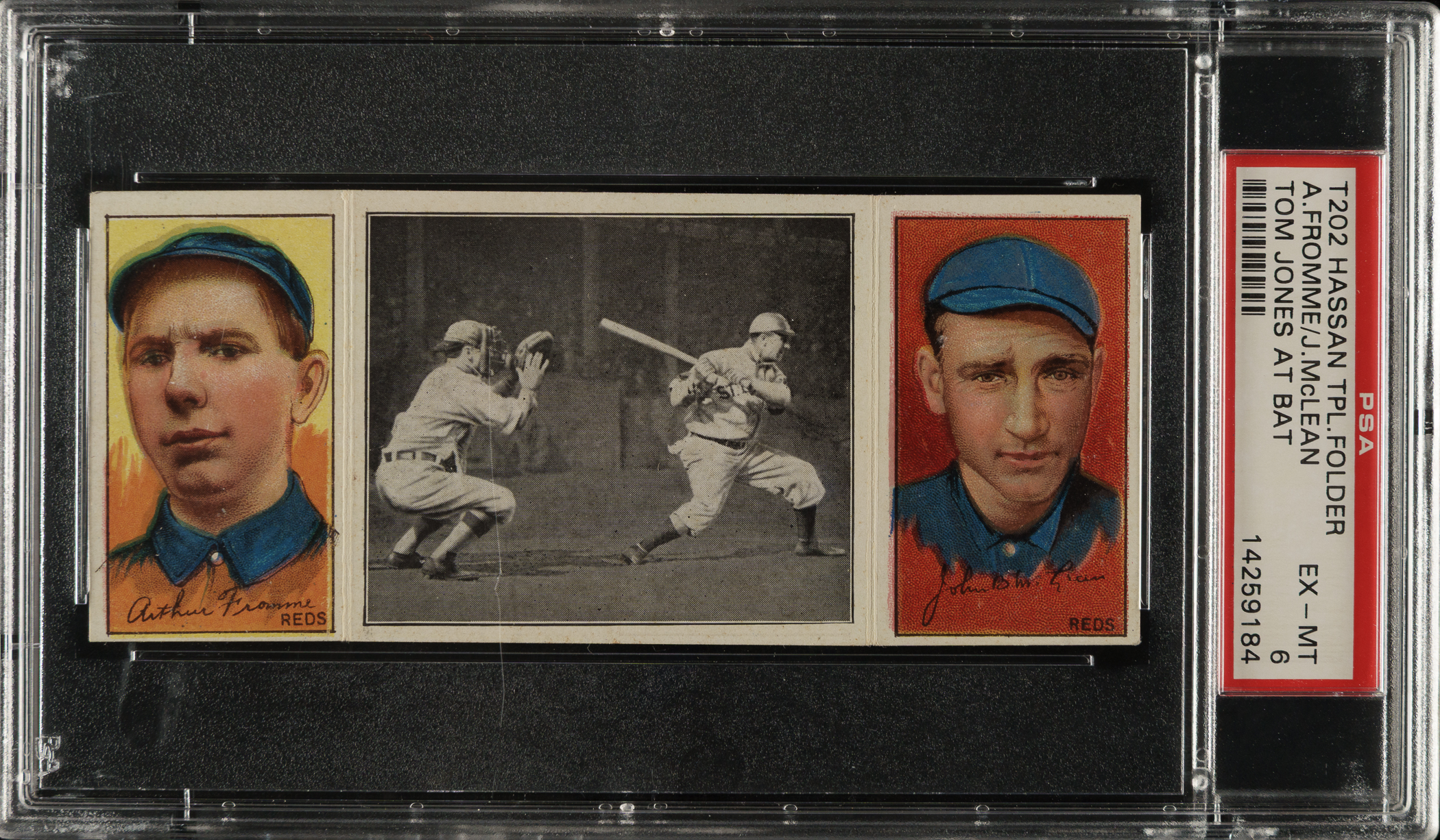 Lot # 1811: 1912 T202 Hassan Triple Folder "Tom Jones At Bat" McLean/Fromme PSA EX-MT 6