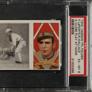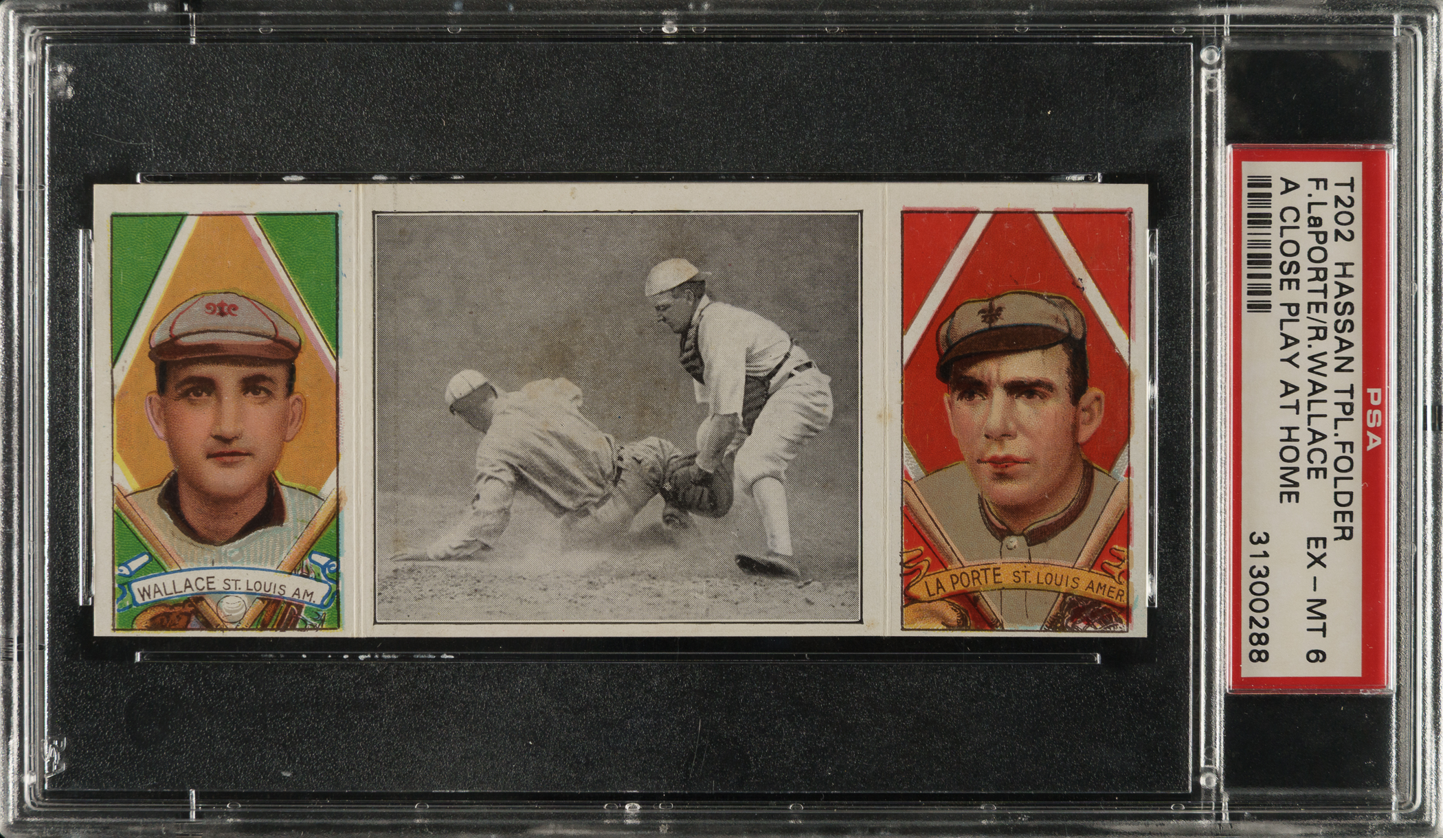 Lot # 1681: 1912 T202 Hassan Triple Folder "A Close Play At Home" Bobby Wallace/LaPorte PSA EX-MT 6