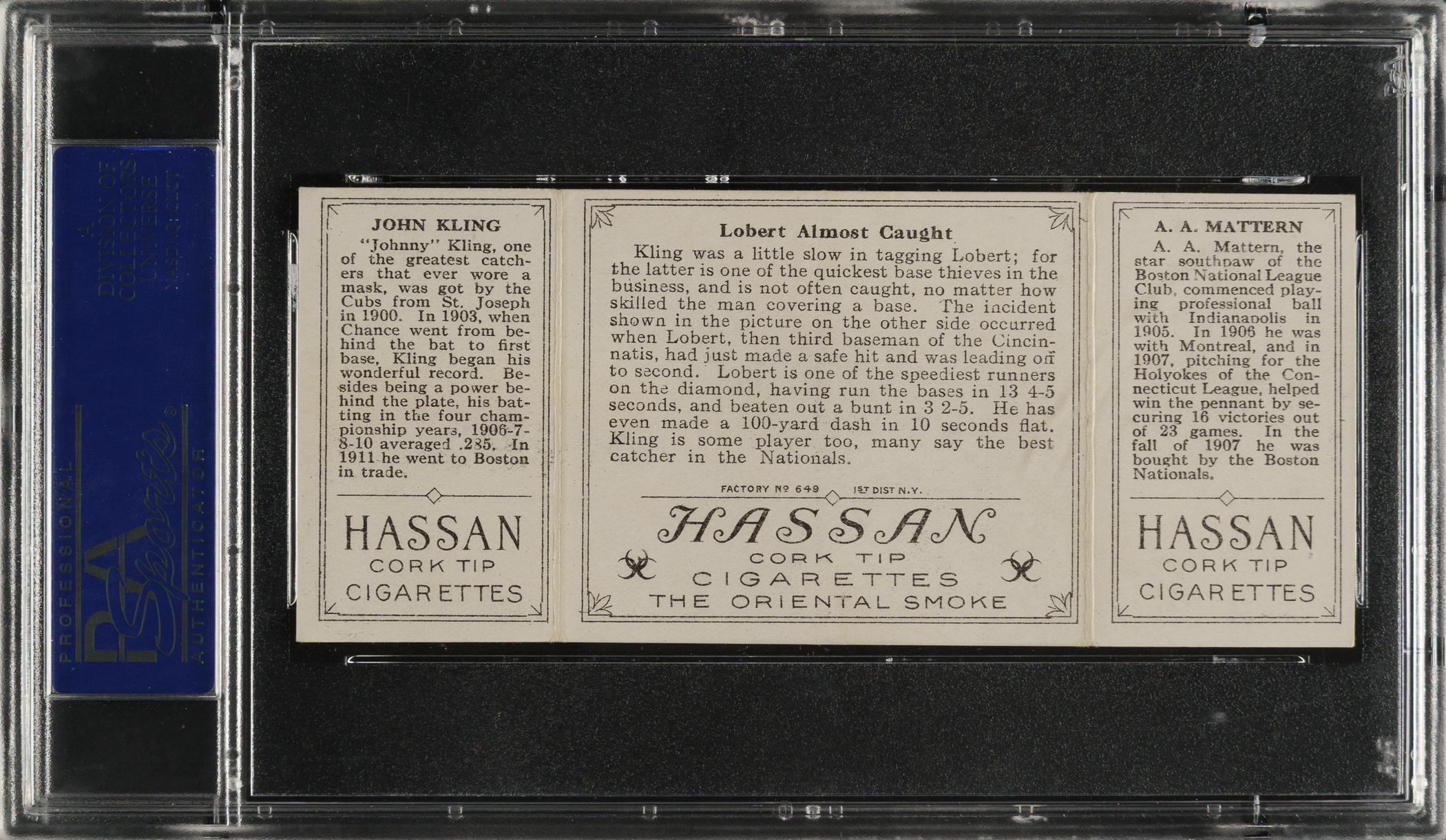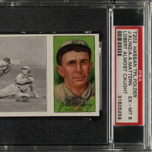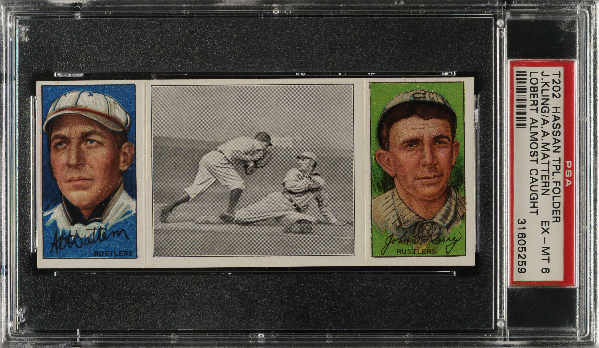 Lot # 1758: 1912 T202 Hassan Triple Folder "Lobert Almost Caught" Mattern/Kling PSA EX-MT 6