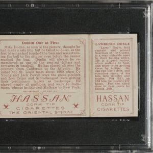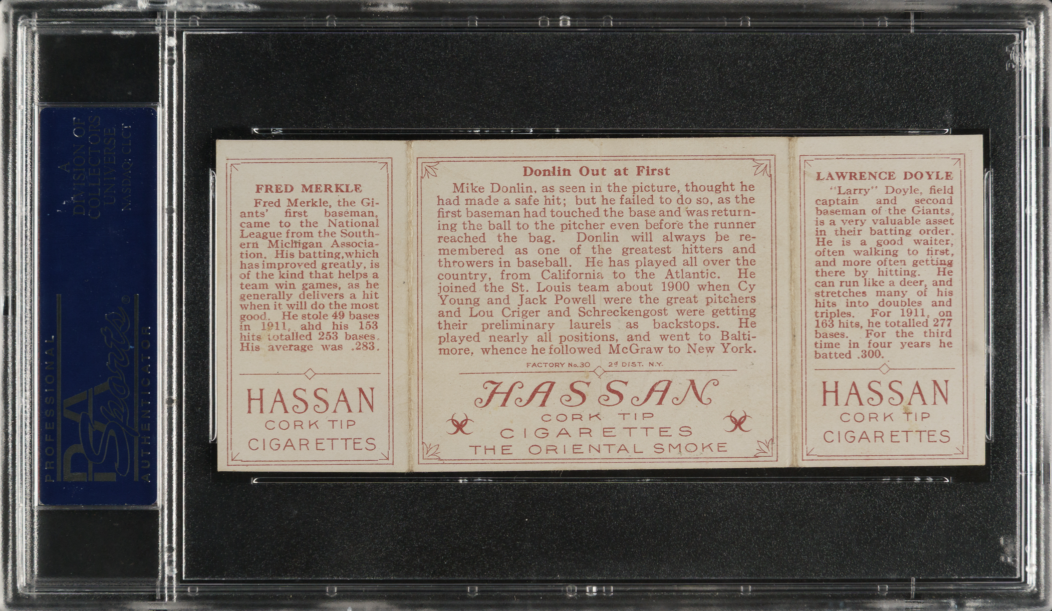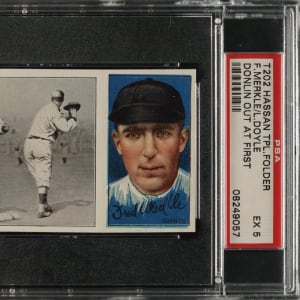 Lot # 1701: 1912 T202 Hassan Triple Folder "Donlin Out At First" Doyle/Merkle PSA EX 5
