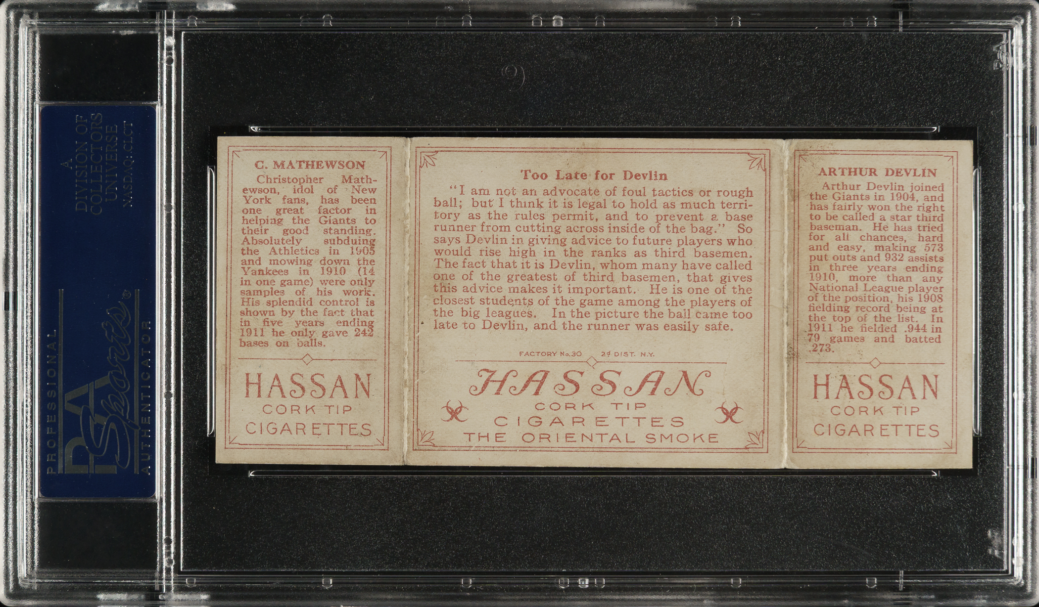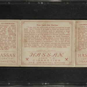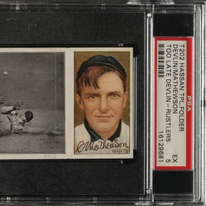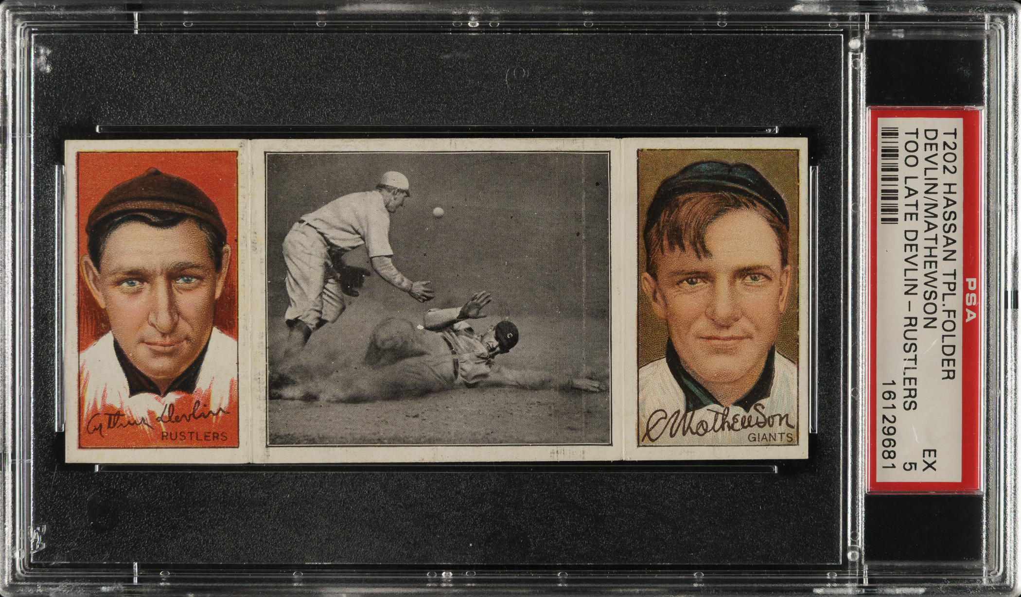 Lot # 1814: 1912 T202 Hassan Triple Folder "Too Late for Devlin" Christy Mathewson/Devlin (Rustlers) PSA EX 5