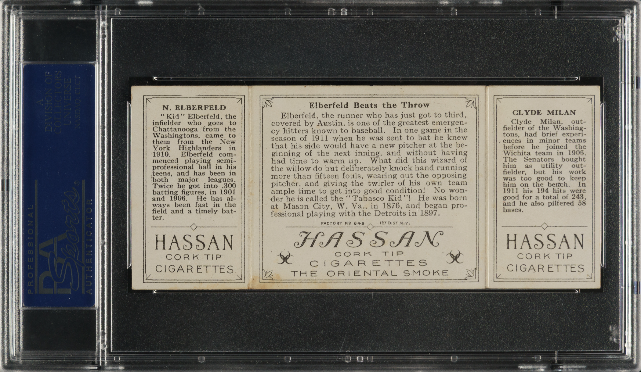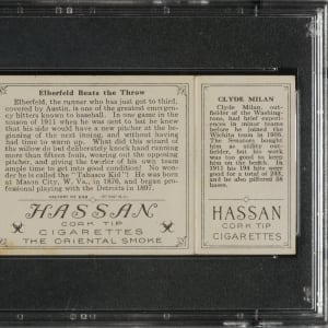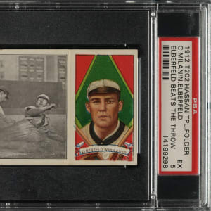 Lot # 1706: 1912 T202 Hassan Triple Folder "Elberfeld Beats the Throw" Elberfeld/Milan PSA EX 5