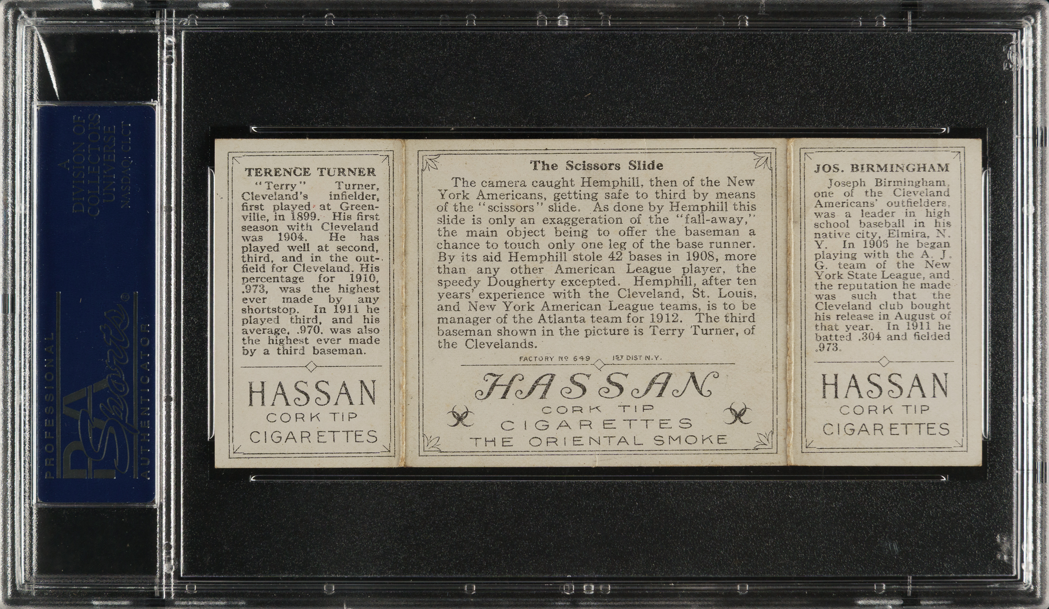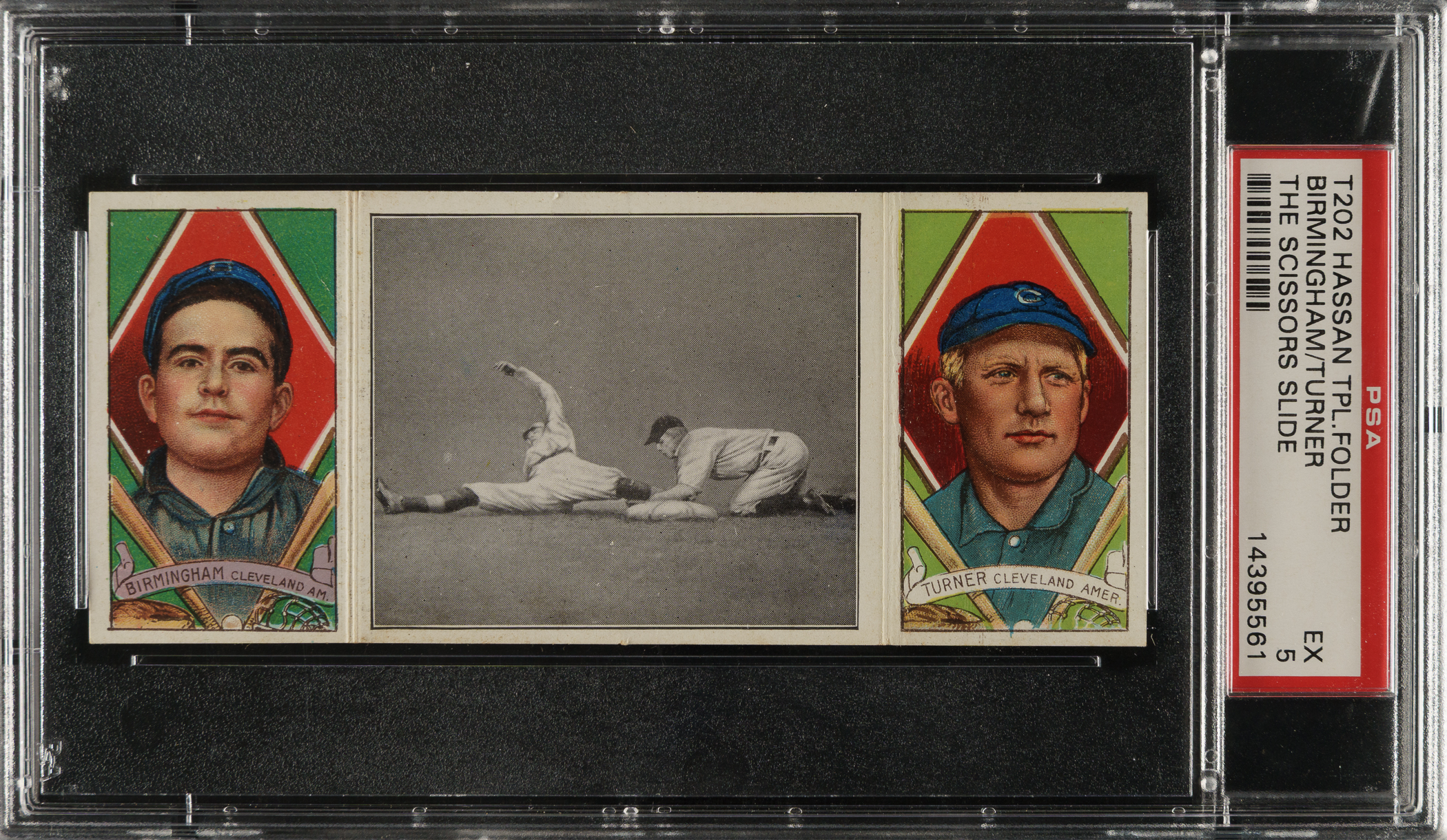 Lot # 1810: 1912 T202 Hassan Triple Folder "The Scissors Slide" Birmingham/Turner PSA EX 5