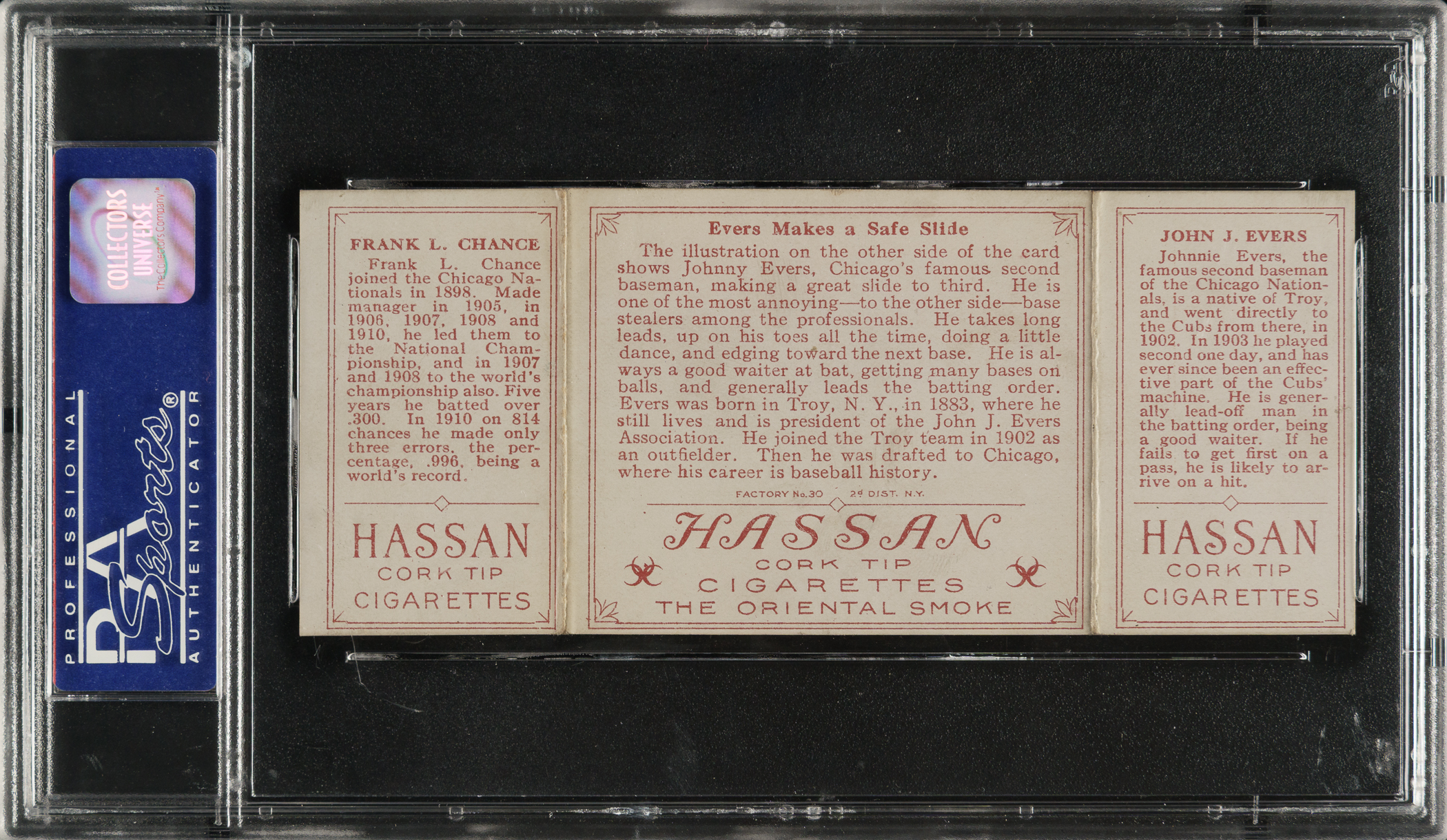 Lot # 1715: 1912 T202 Hassan Triple Folder "Evers Makes A Safe Slide" Joe Tinker/Frank Chance PSA EX 5