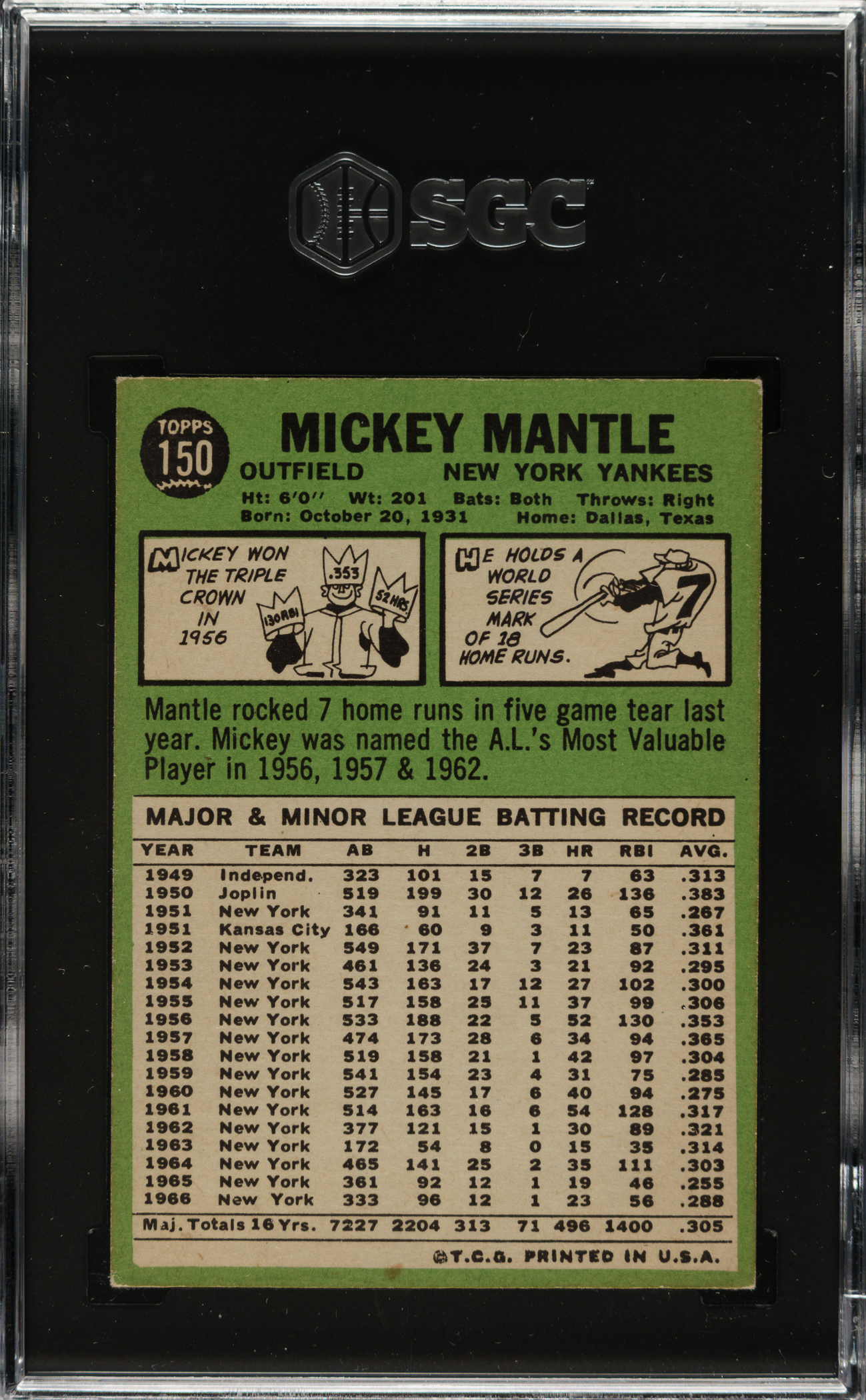 Lot # 3078: 1967 Topps #150 Mickey Mantle SGC VG/EX+ 4.5