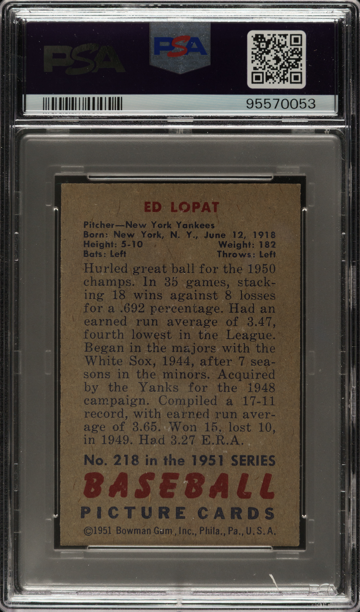 Lot # 2434: 1951 Bowman #218 Ed Lopat PSA NM-MT 8