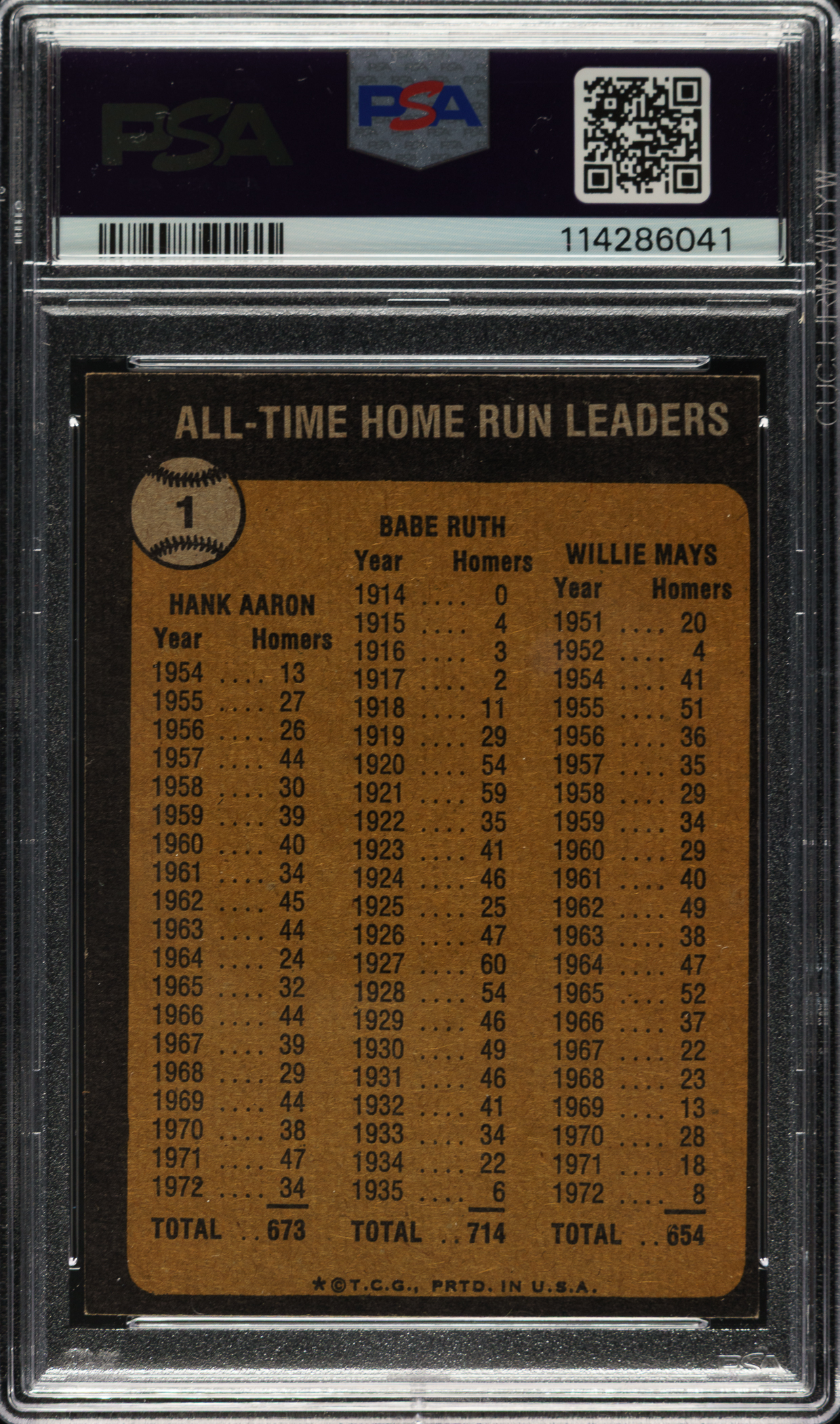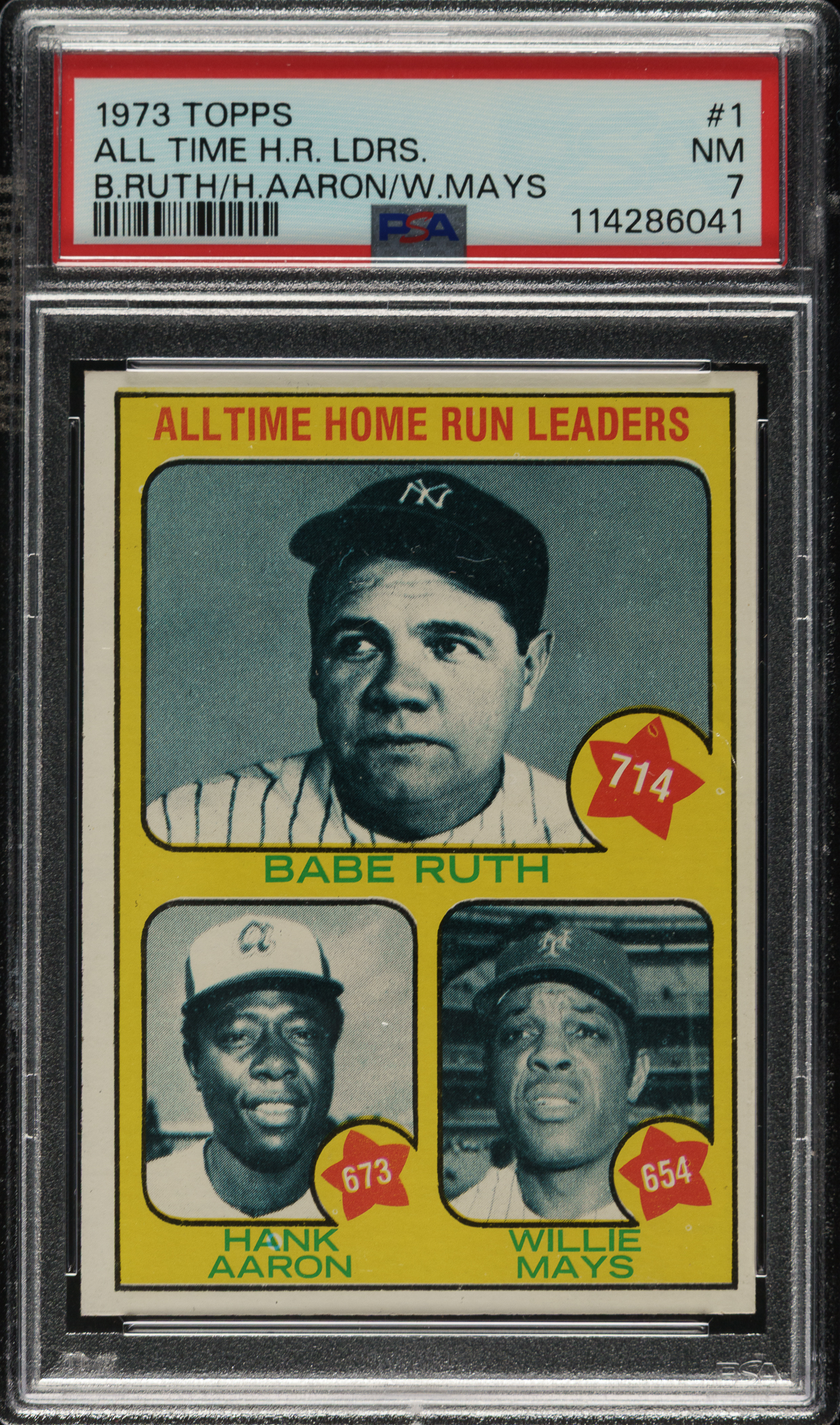 Graded NM 7 by PSA. Featuring Hall of Famers Hank Aaron (Atlanta Braves), Willie Mays (San Francisco Giants), and Babe Ruth (New York Yankees).