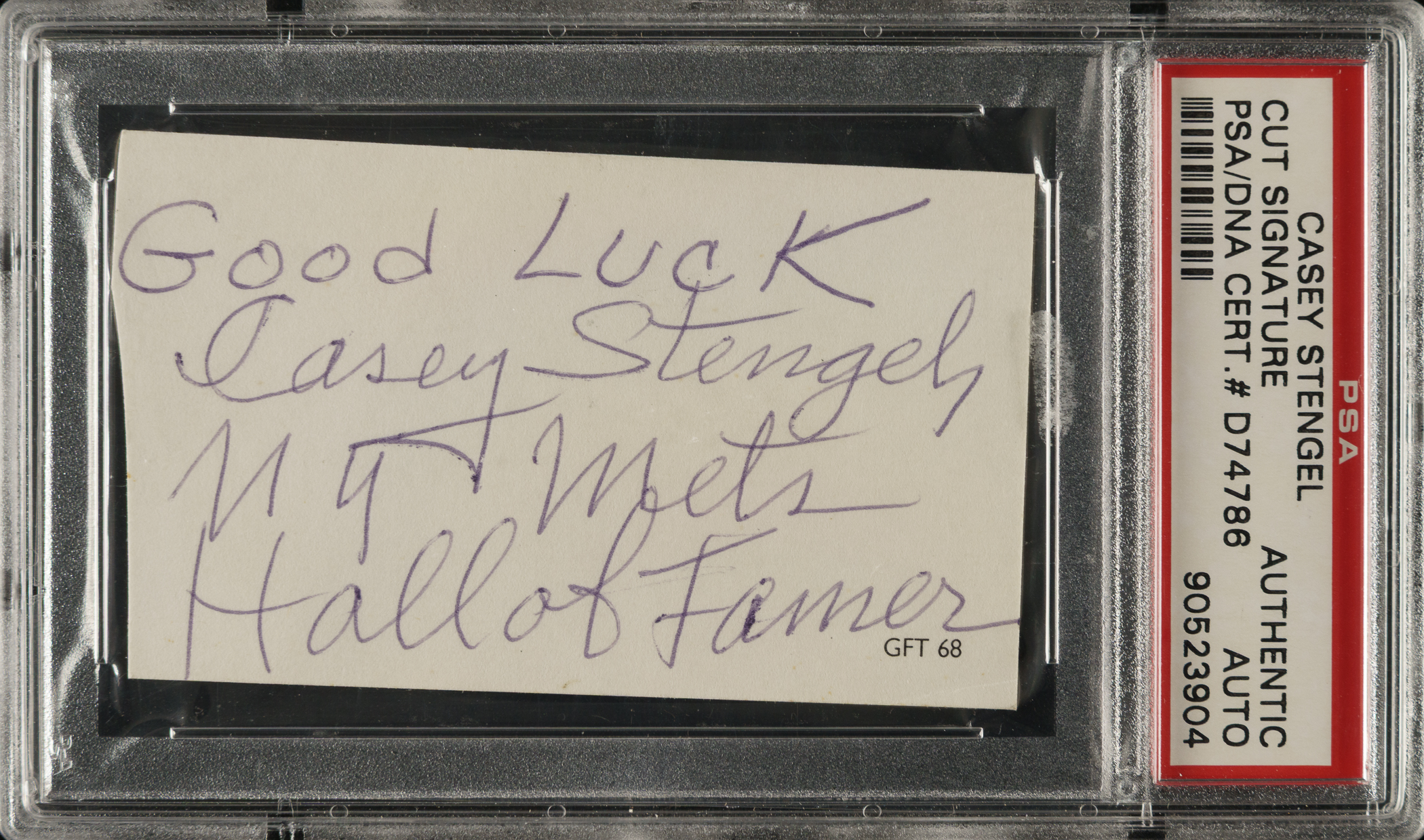 PSA/DNA has encapsulated the cut, grading the signature Authentic. New York Mets Hall of Famer Casey Stengel.