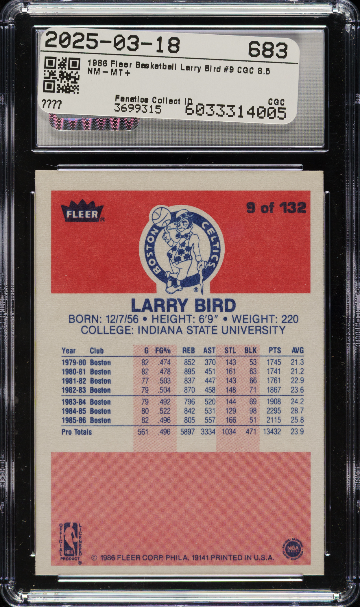 Graded NM/MINT+ 8.5 by CGC. Boston Celtics Hall of Famer Larry Bird.
