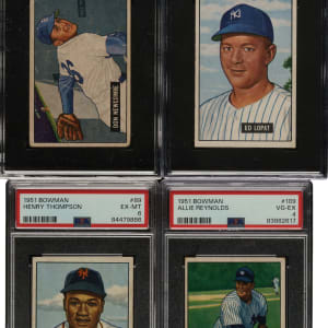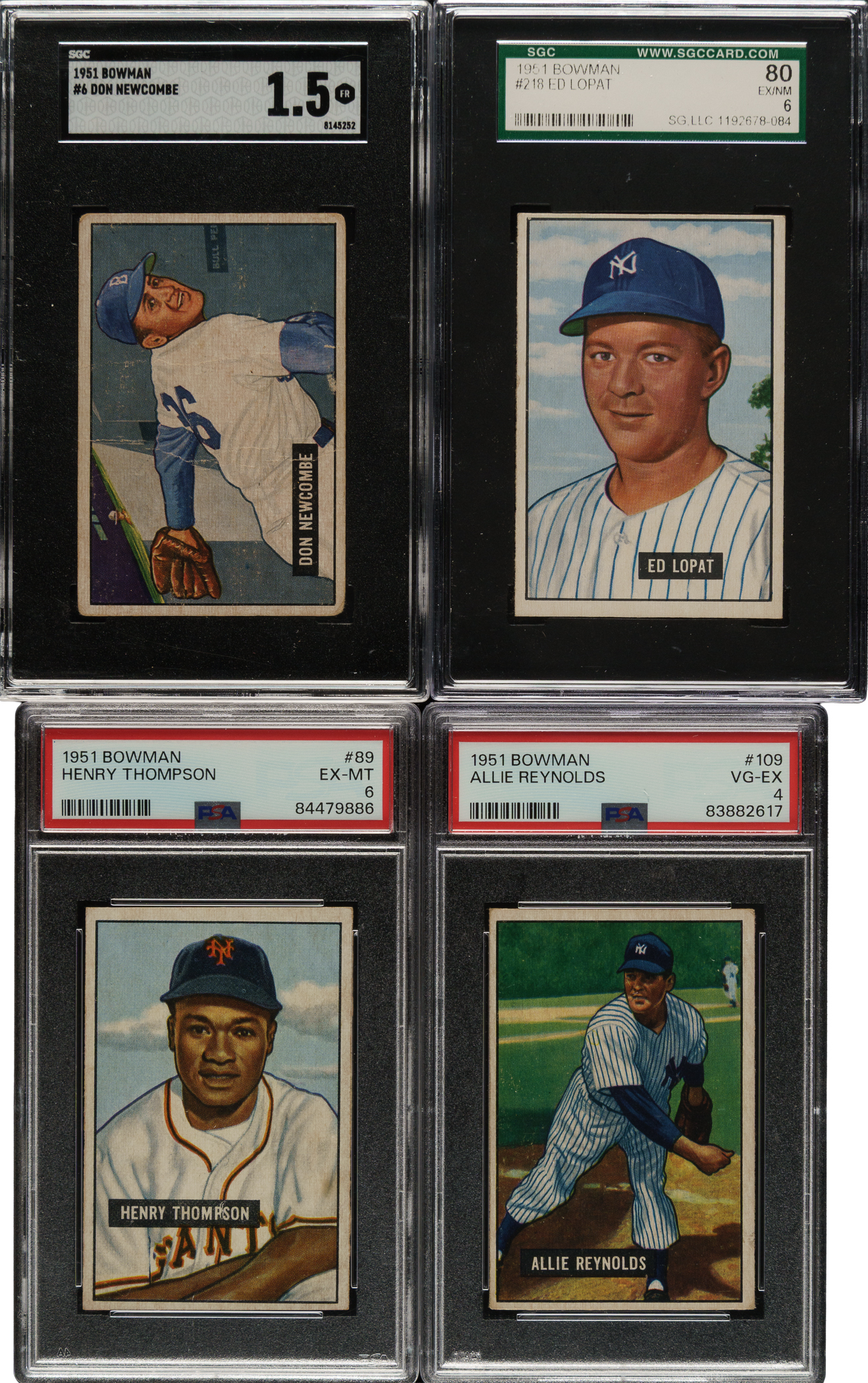 Collection of seventeen 1951 Bowman cards, each graded and encapsulated by PSA (13) and SGC (4). PSA Grading Composite: NM 7 (3 cards): #45, 142, and 180. EX-MT 6 (6 cards): #89, 102, 104, 218 (SGC EX/NM 80), 223, and 226. EX 5 (6 cards): #54, 81 (SGC EX 60), 118, 127 (SGC EX 60), 192, and 210. VG-EX 4 (1 card): #109. FAIR 1.5 (1 card): #6 (SGC). Total: 17 cards. The size/weight of this item requires that there will be an additional shipping charge for this lot.